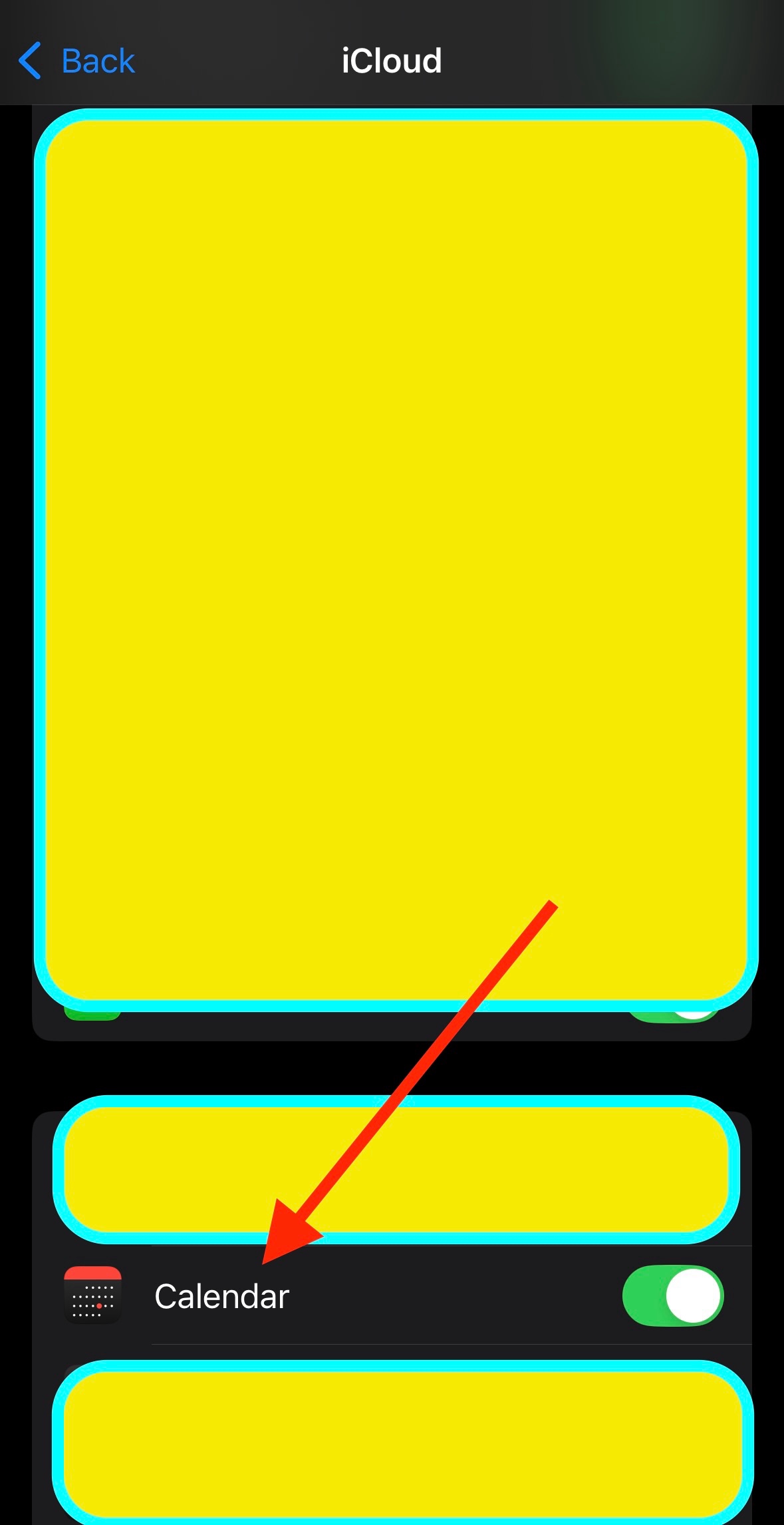 iOS 18: There are different setting toggle options shown for two Apple iOS calendars in Settings > iCloud > Saved to iCloud.