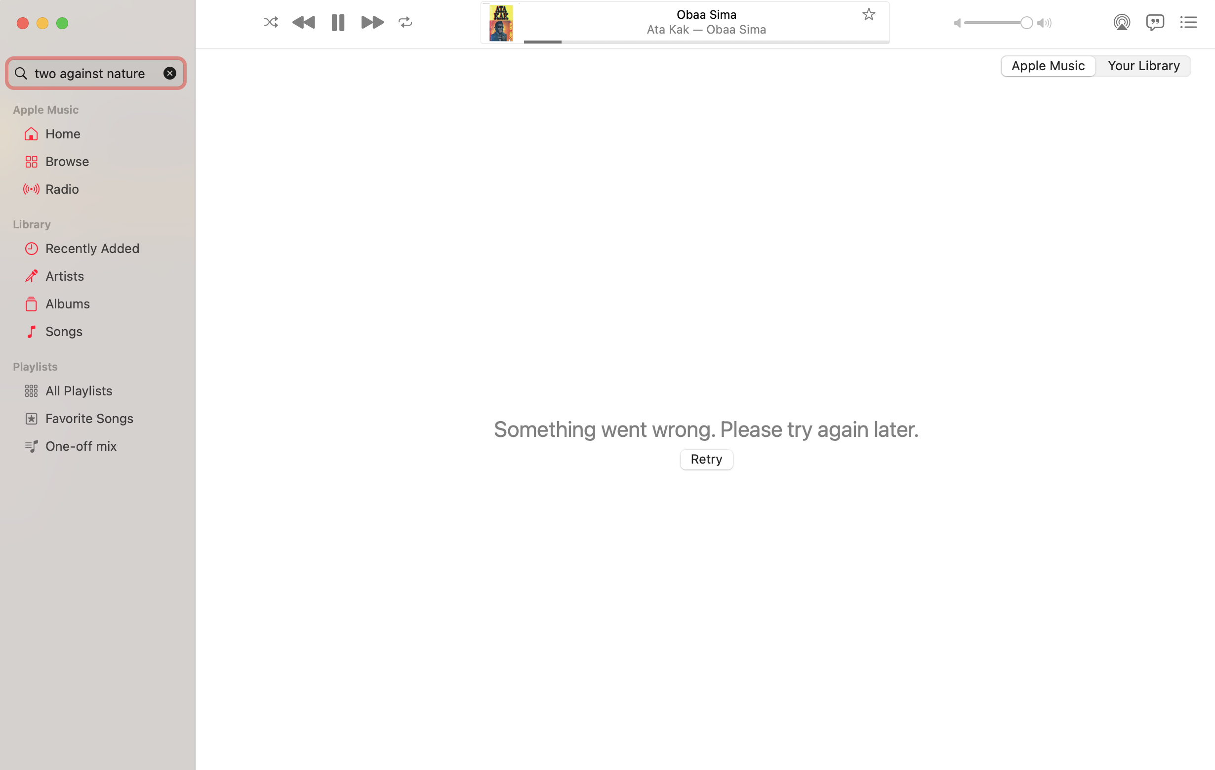 Inputting any search terms and pressing return consistently leads to the message: "Something went wrong. Please try again later":