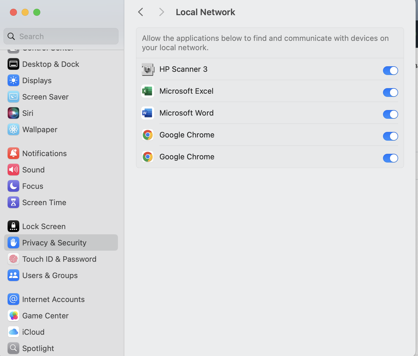 I recently upgraded my MacBook Air's MacOS and Chrome browser, and now I can't cast to my Chromecast device. When I try, I get the following message: "To cast, give Chrome access in system settings" - along with a helpful link to the Security and Privacy settings. For the life of me, I can't figure out which settings need to be set to allow casting. Search engine searches turn up one page, which helpfully describes this as "not an issue" with Chrome.