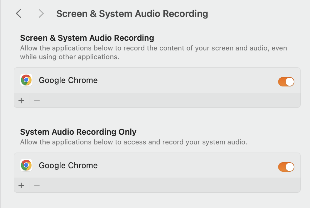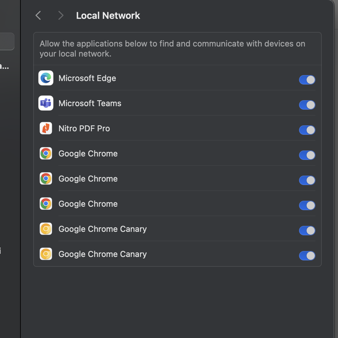 I recently upgraded my MacBook Air's MacOS and Chrome browser, and now I can't cast to my Chromecast device. When I try, I get the following message: "To cast, give Chrome access in system settings" - along with a helpful link to the Security and Privacy settings. For the life of me, I can't figure out which settings need to be set to allow casting. Search engine searches turn up one page, which helpfully describes this as "not an issue" with Chrome.