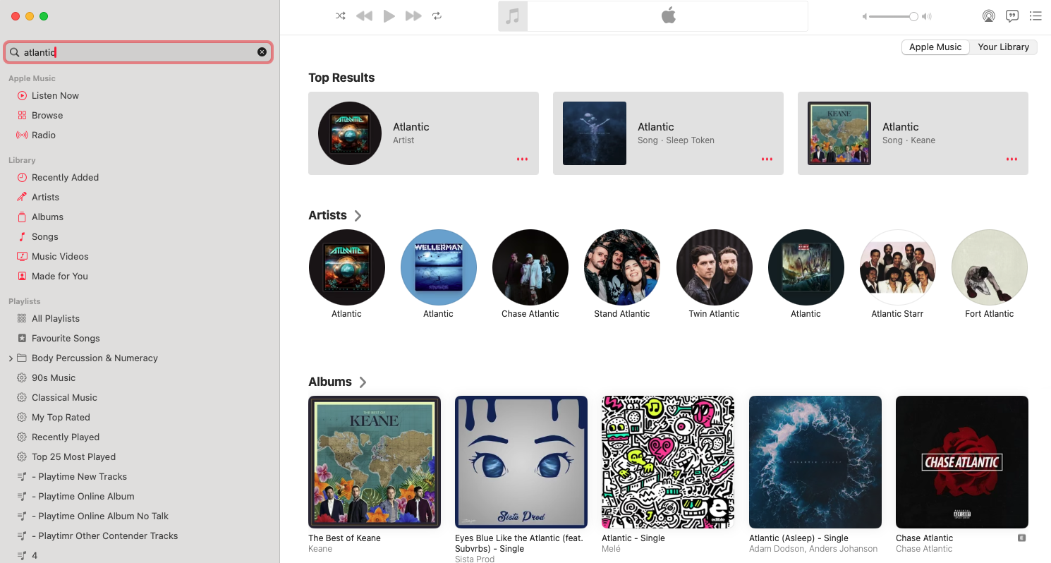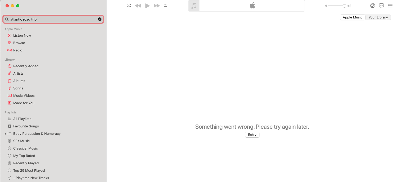 Search in Apple Music fails if there is a space in the search term - and says 'Something went wrong. Please try again later. with a retry button" . So if I search for 'Atlantic' - fine gets lots of results , if I search 'Atlantic Road Trip' get 'Something went wrong..."