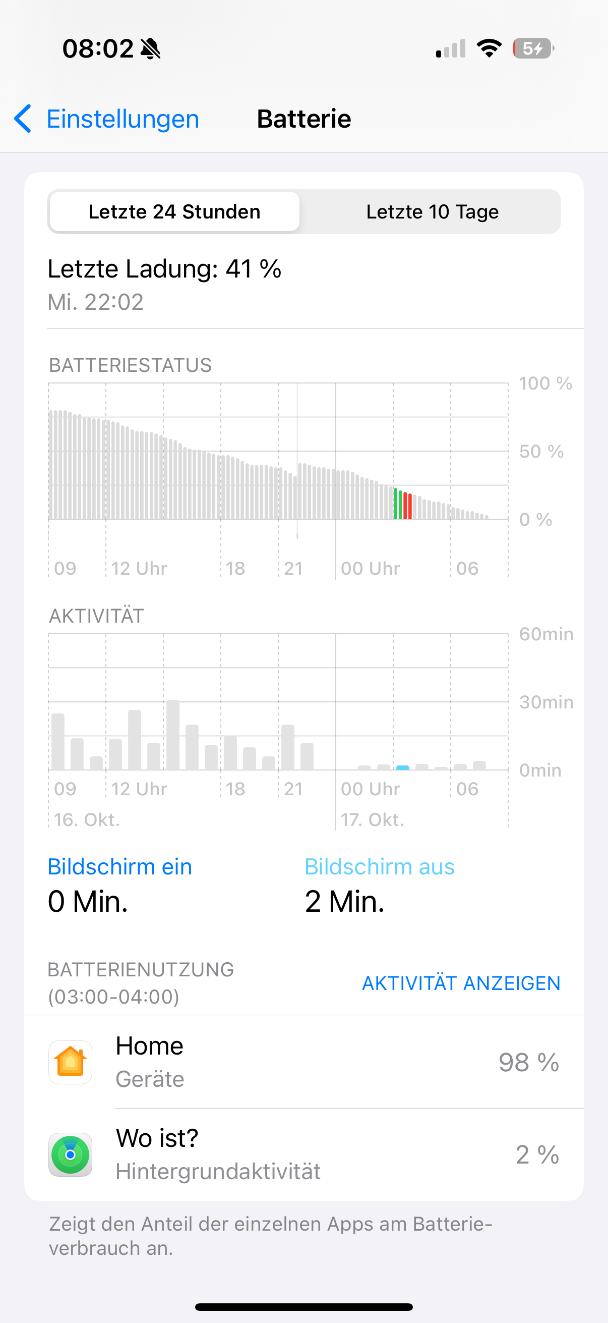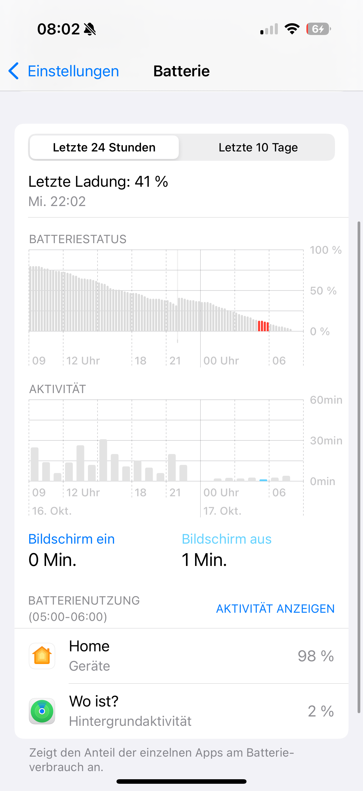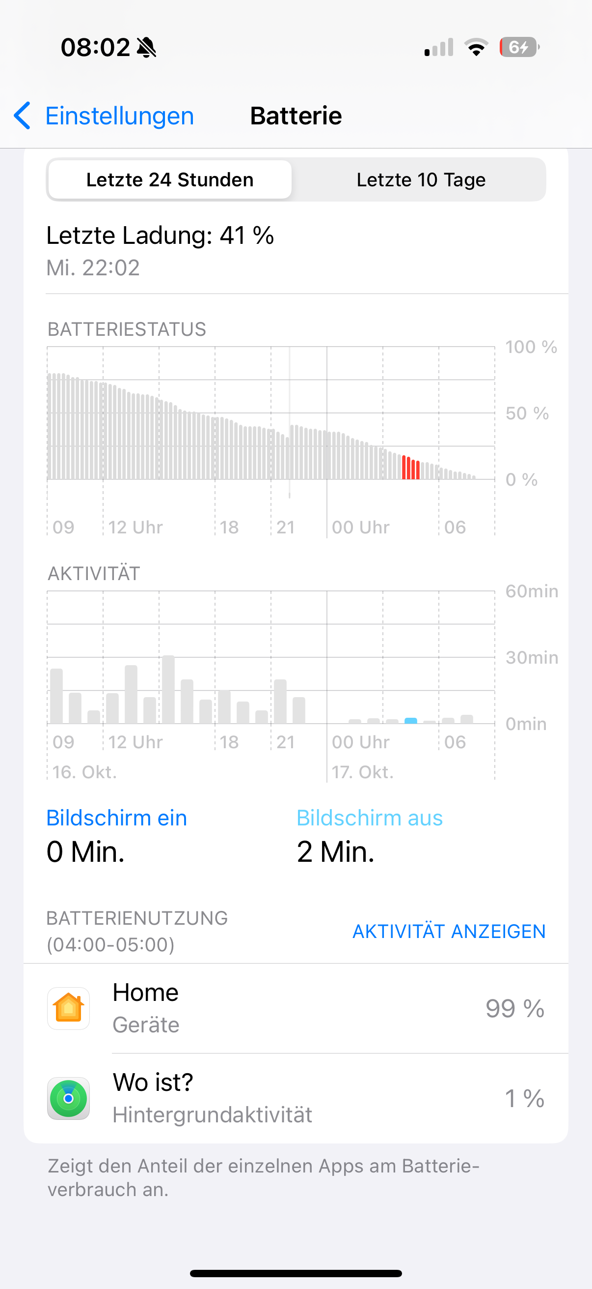 Hey, so as you can see my iPhone 16 Pro went from 41% to 2% over night. I was quite shocked when I saw that. You can see that „Home“ seems to be the problem? I did not even use the app yesterday…