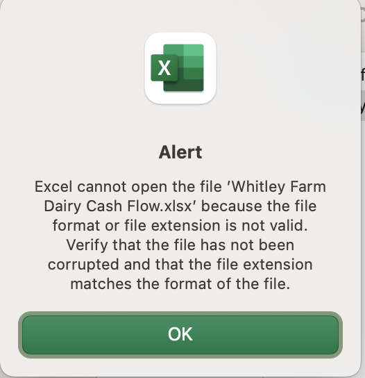 The file appears to be corrupted and cannot be opened (will not open in Numbers either).
