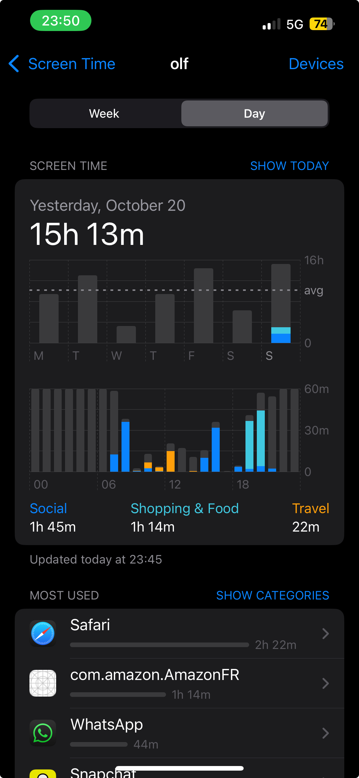 My screen time on my iPhone has gone crazy for a little less than a week now and I have no idea what is causing this. You can clearly see which app I used the most, how long I've used it, and that it does not match with the overall screen time of the day. What makes the screen time so long are those grey areas that essentially appear during the night (on the first pics) but also at some random times of the day (on the last pics). So I was wondering what were those grey areas and how I could not have them included in my screen time.