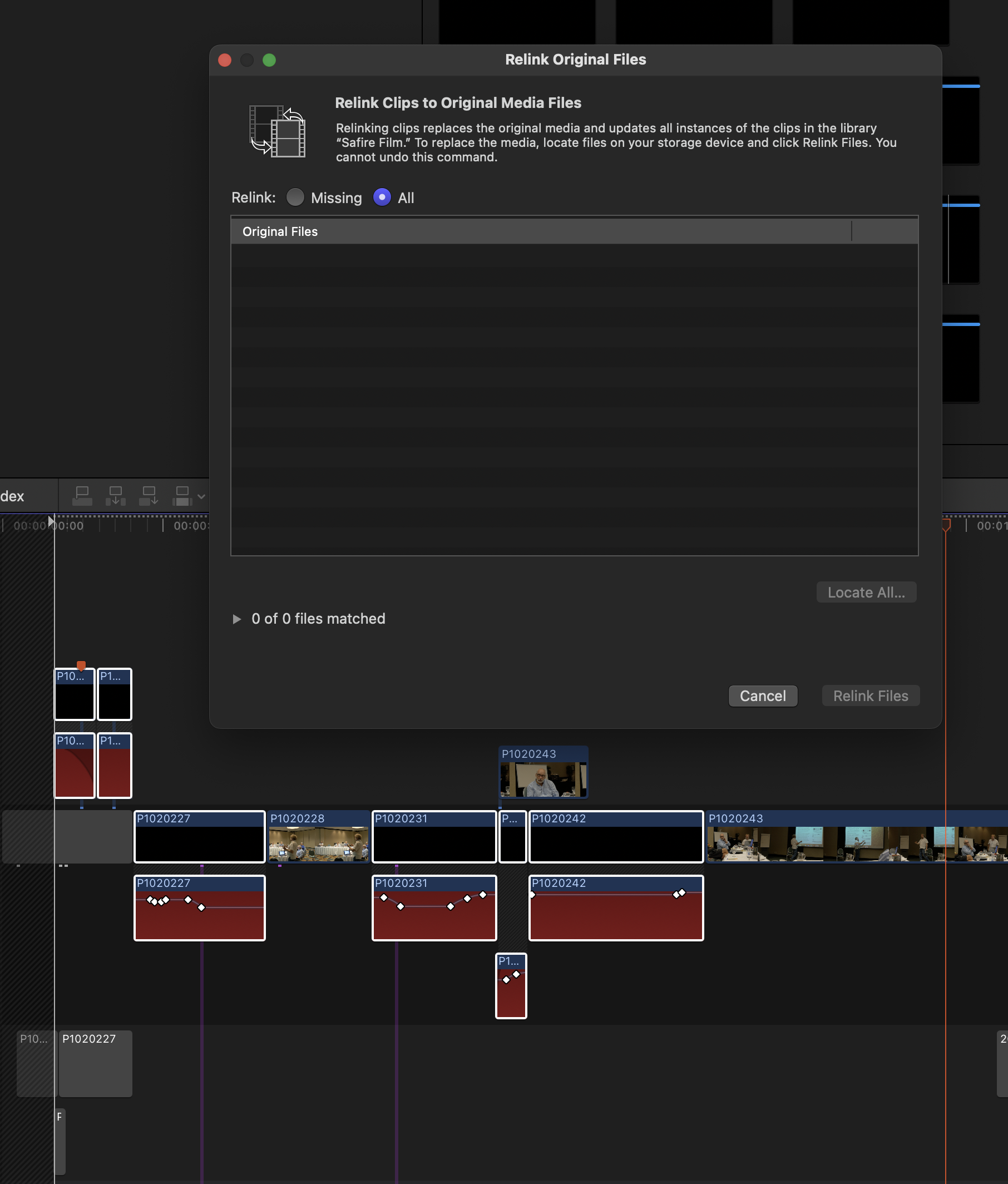 Aie yie yie!! And if I go back to a backup of the original Library -- which is supposedly still linked to the external Media on another drive. When I try to relink the clips to the Original Media (which I can SEE on the drive!) the Relink Original Drive pop-up box doesn't show any missing original files. See last attachment below.