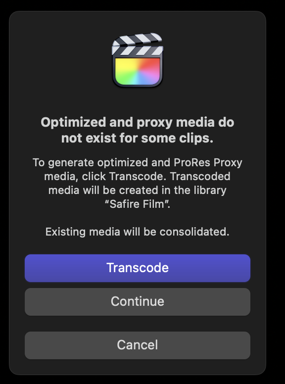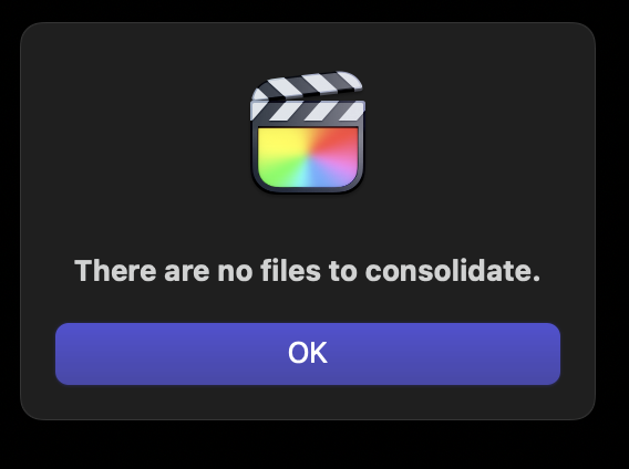 SEE ATTACHMENTS BELOW: When I redo 'Consolidate' FCPX, and select 'Original/Optimized/Proxy Media' FCPX has a pop-up that says 'Original media does not exist for some clips.' (though all the clips I need are sitting on the original external drive). I click 'Continue' to 'Consolidate available media'. And FCPX gives me the pop-up: 'Optimized and proxy media do not exist for some clips.' I don't want to transcode new optimized or proxy media, so I click 'Continue'. Then FCPX gives me another pop-up that says: 'There are no files to consolidate.' But a whole bunch of clips have been replaced by aliases, not moved to the Library.