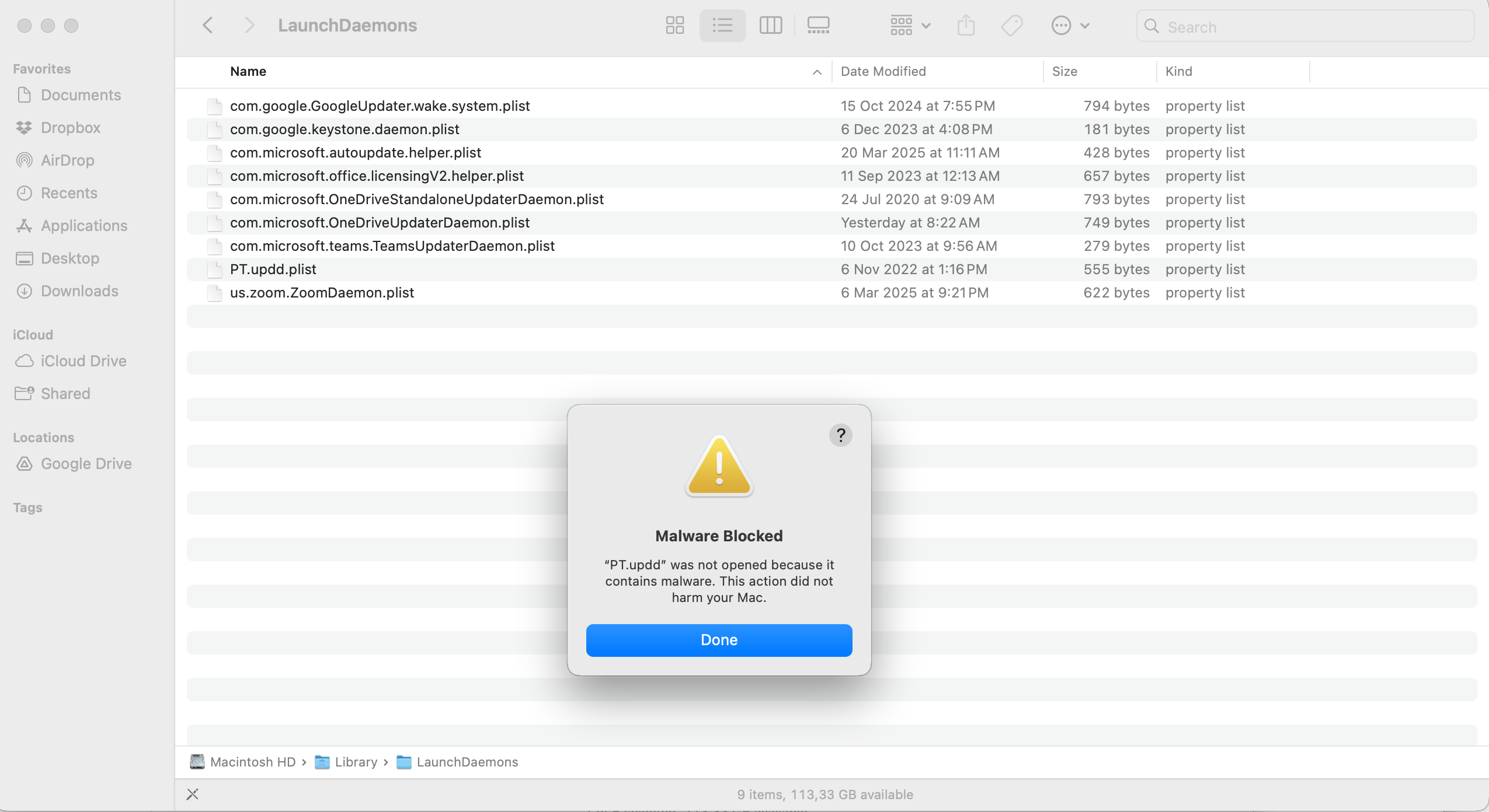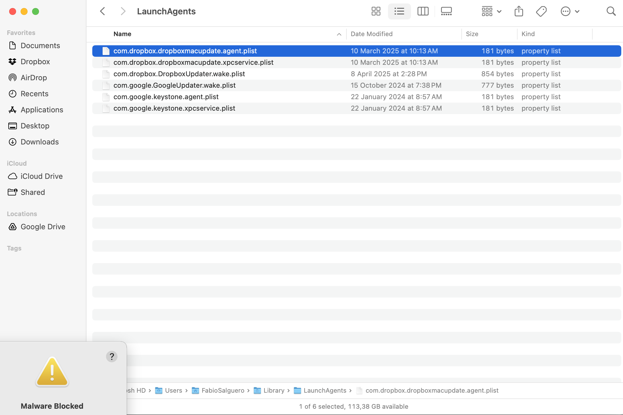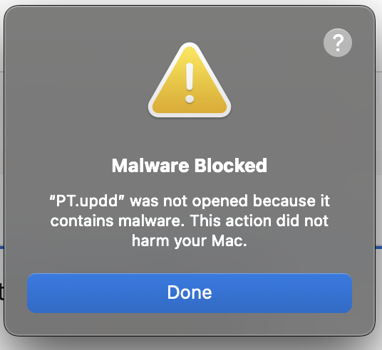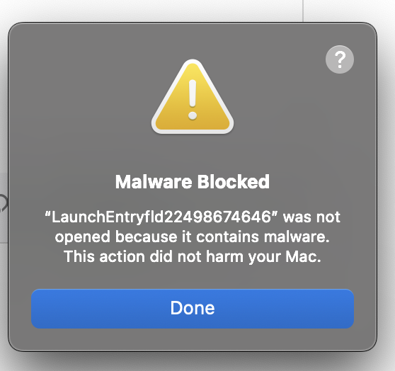 I keep getting a "Malware Blocked" alert window. After selecting "Done" is goes away momentarily and then reappears. It is the same file name each time. I tried to search for the file name to trash it but I cannot find it.