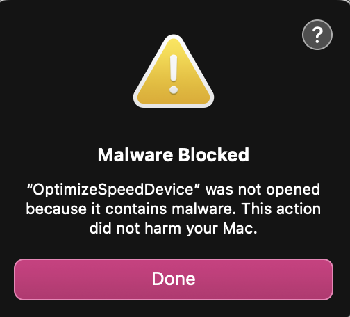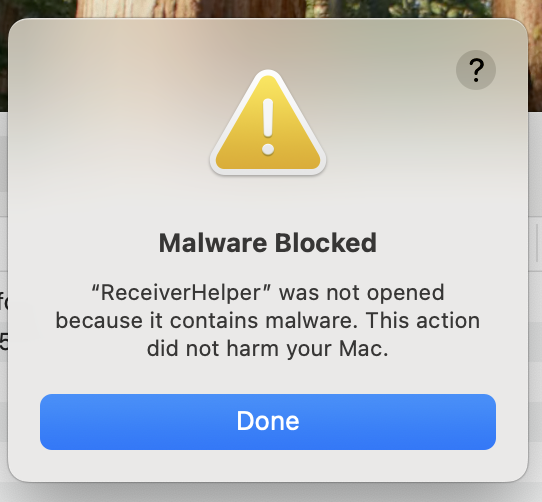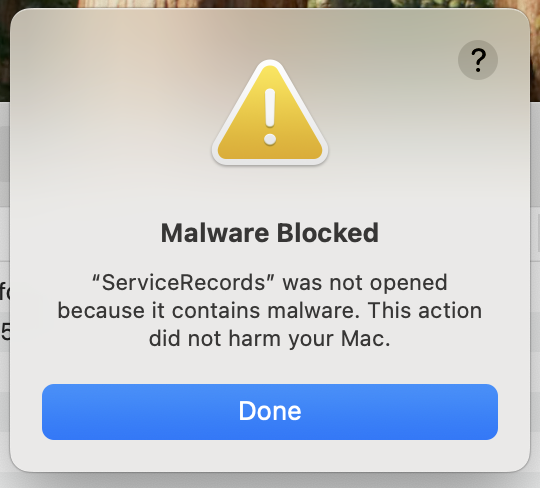 I keep getting a "Malware Blocked" alert window. After selecting "Done" is goes away momentarily and then reappears. It is the same file name each time. I tried to search for the file name to trash it but I cannot find it.