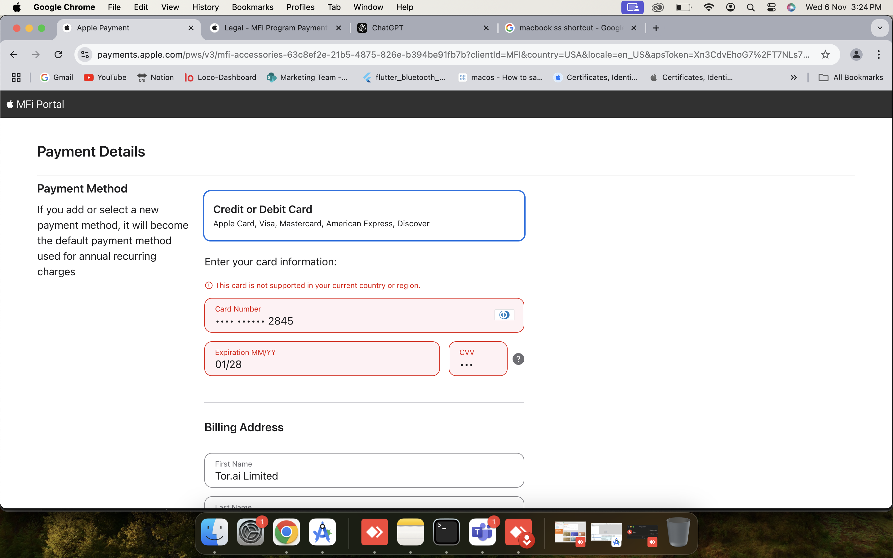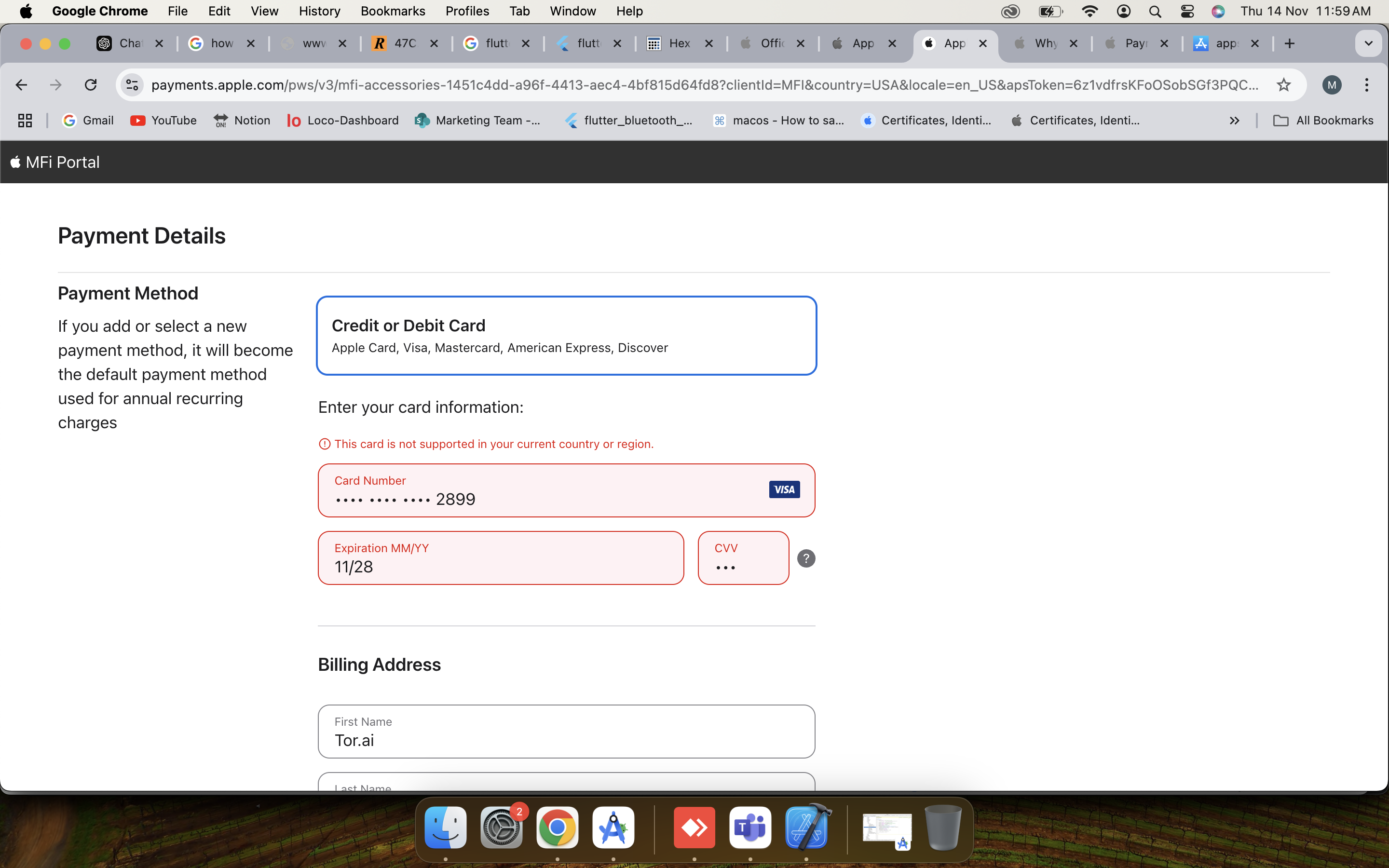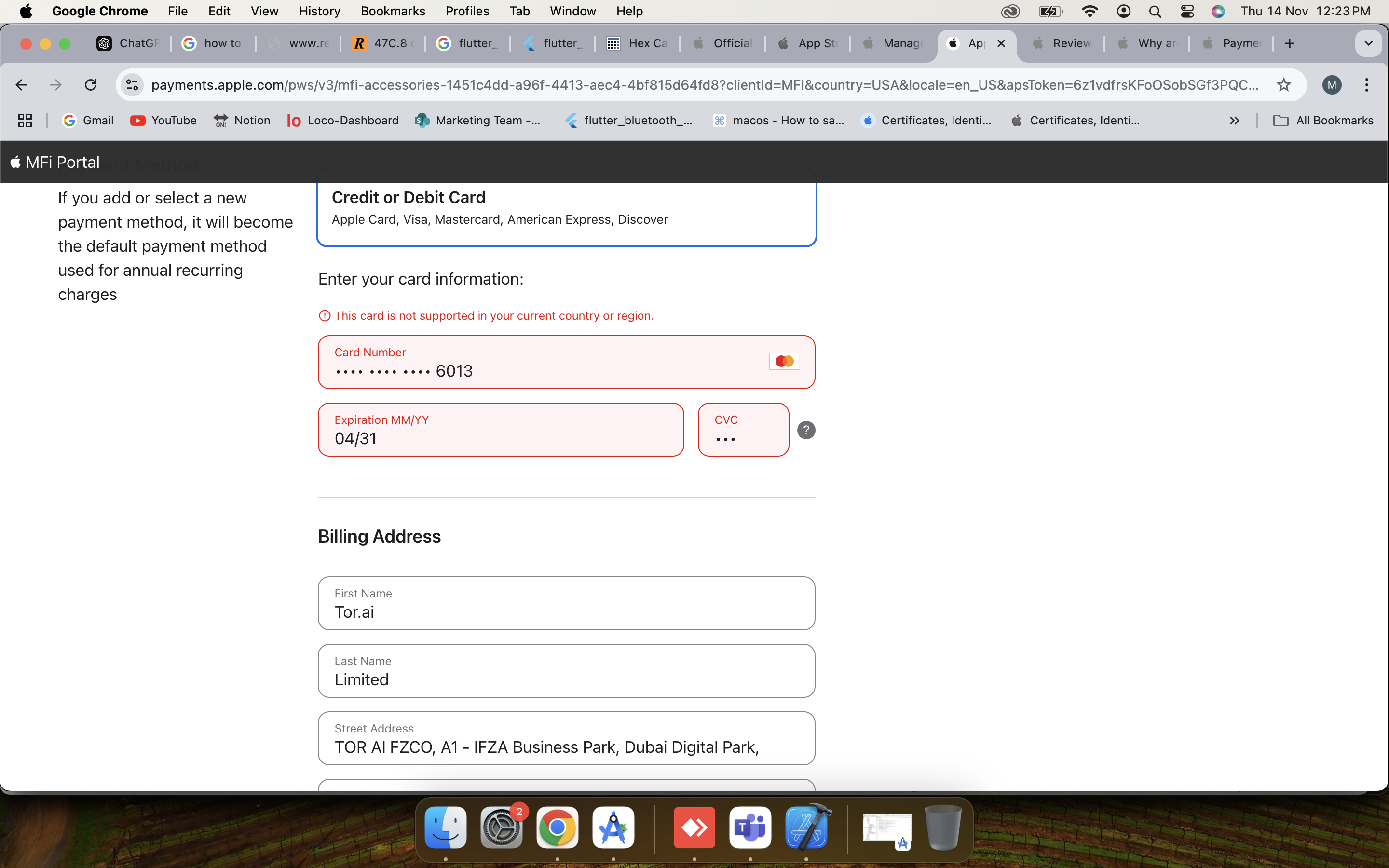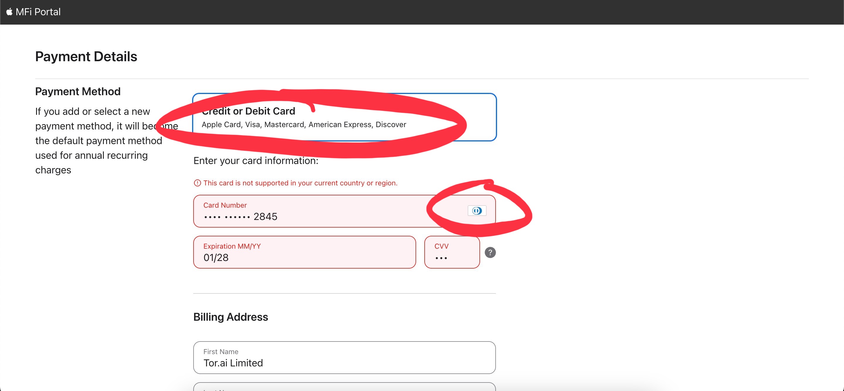 The message "The card is not supported in your current country or region" keeps appearing, even though we've tried both Visa and MasterCard.