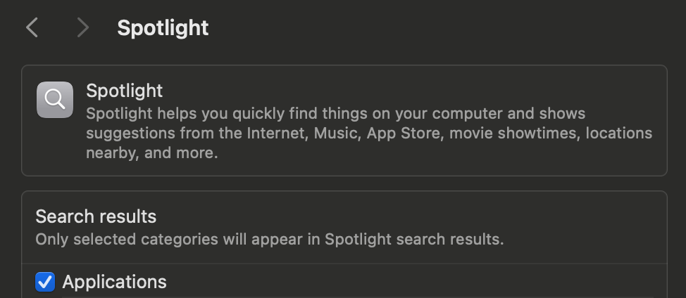 I've been super annoyed by spotlight not finding apps since updating to Sequoia on both personal and work computers - after both reading this thread and a google search. I first tried unchecking and re-checking the applications checkbox as referenced here - it didn't seem to help.