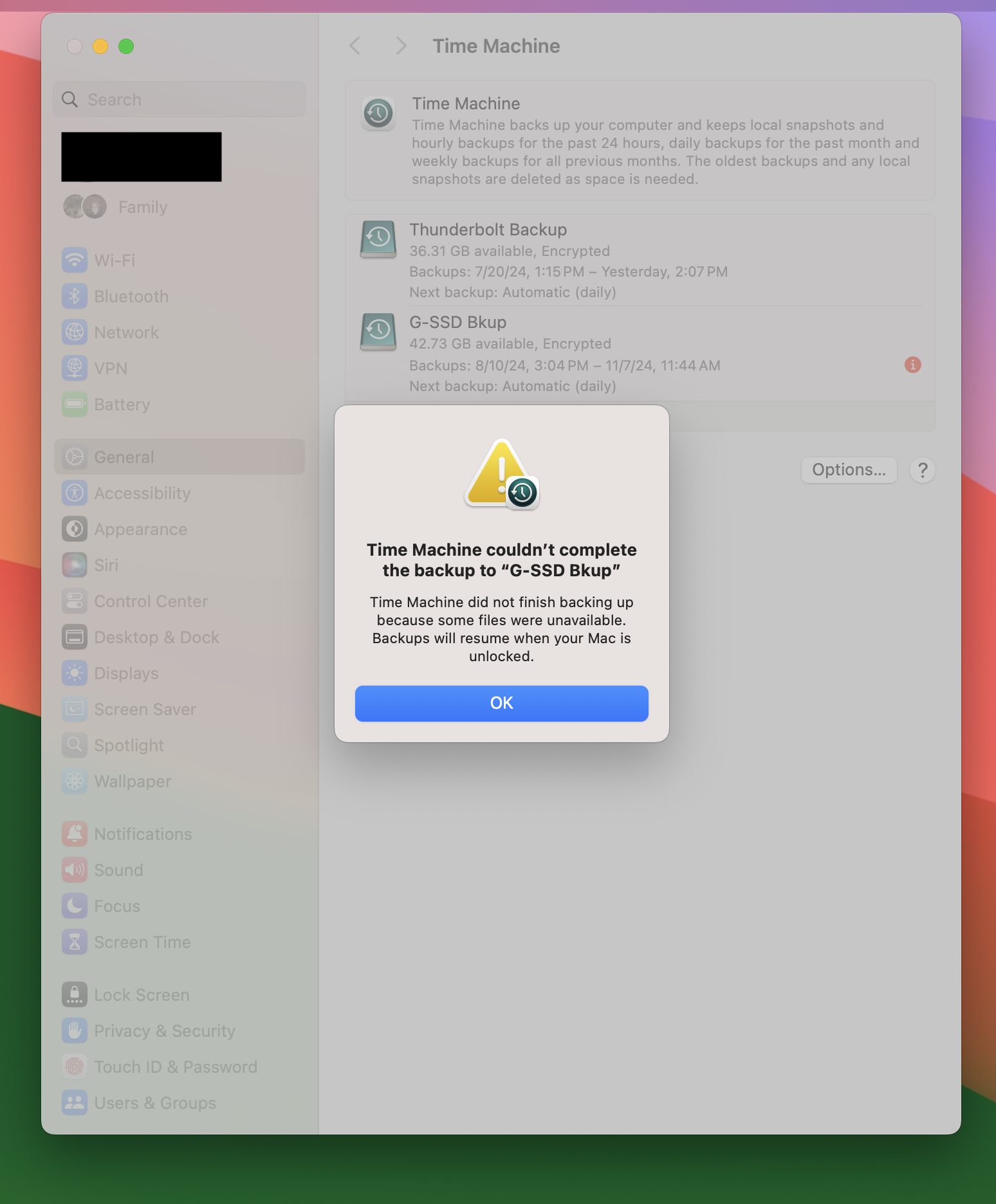 macOS 15.1 Time Machine Could Not Complete Backup -"Some Files Were Unavailable Message"