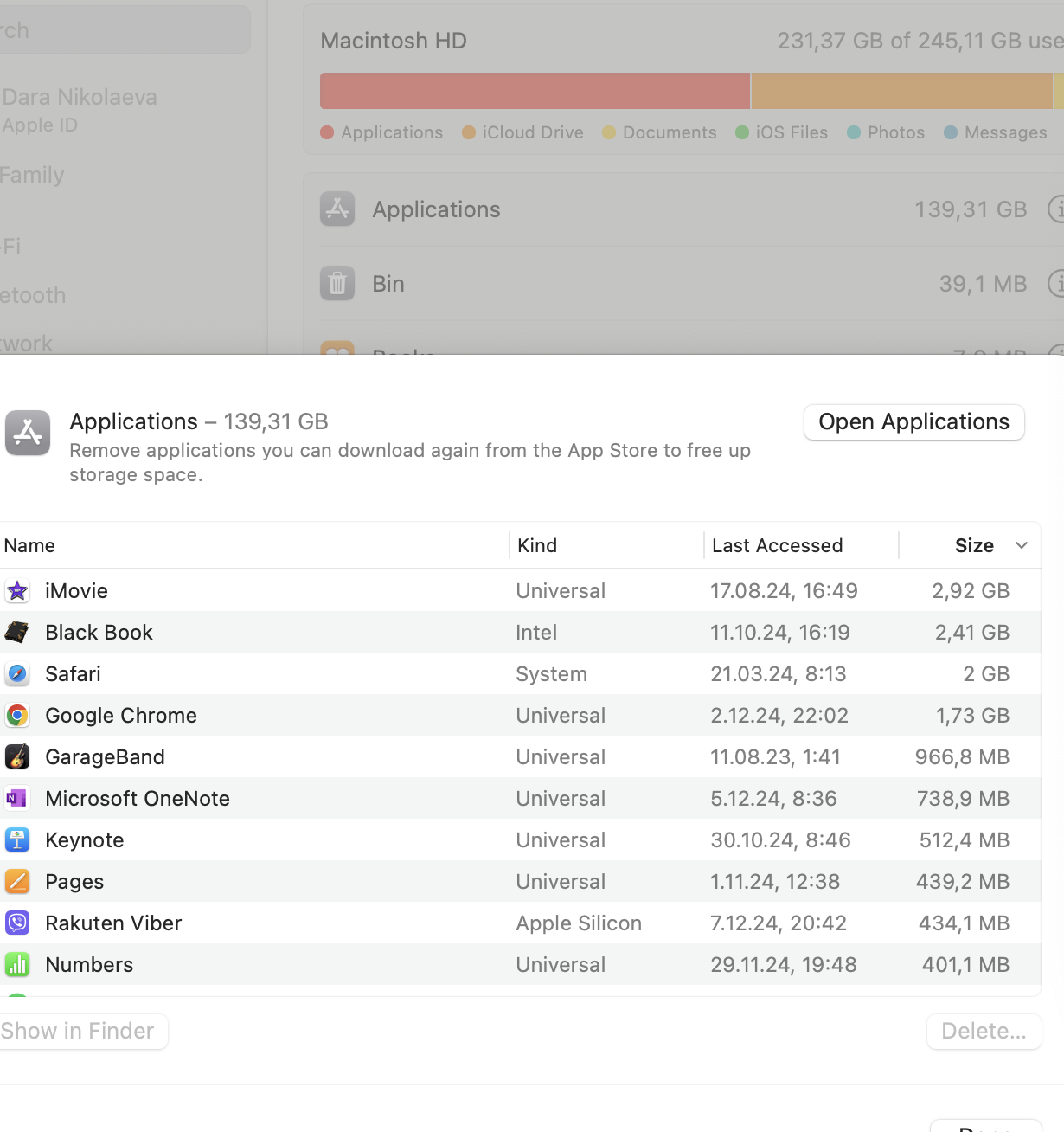 I checked how much free storage I have and was shocked by the fact that I also have only 13 GB of storage. It tells me that I have 140 GB of storage taken from applications but I barely have any heavy ones and the numbers don't add up. My biggest application is iMovie with a 2.92.