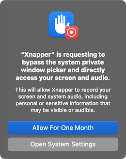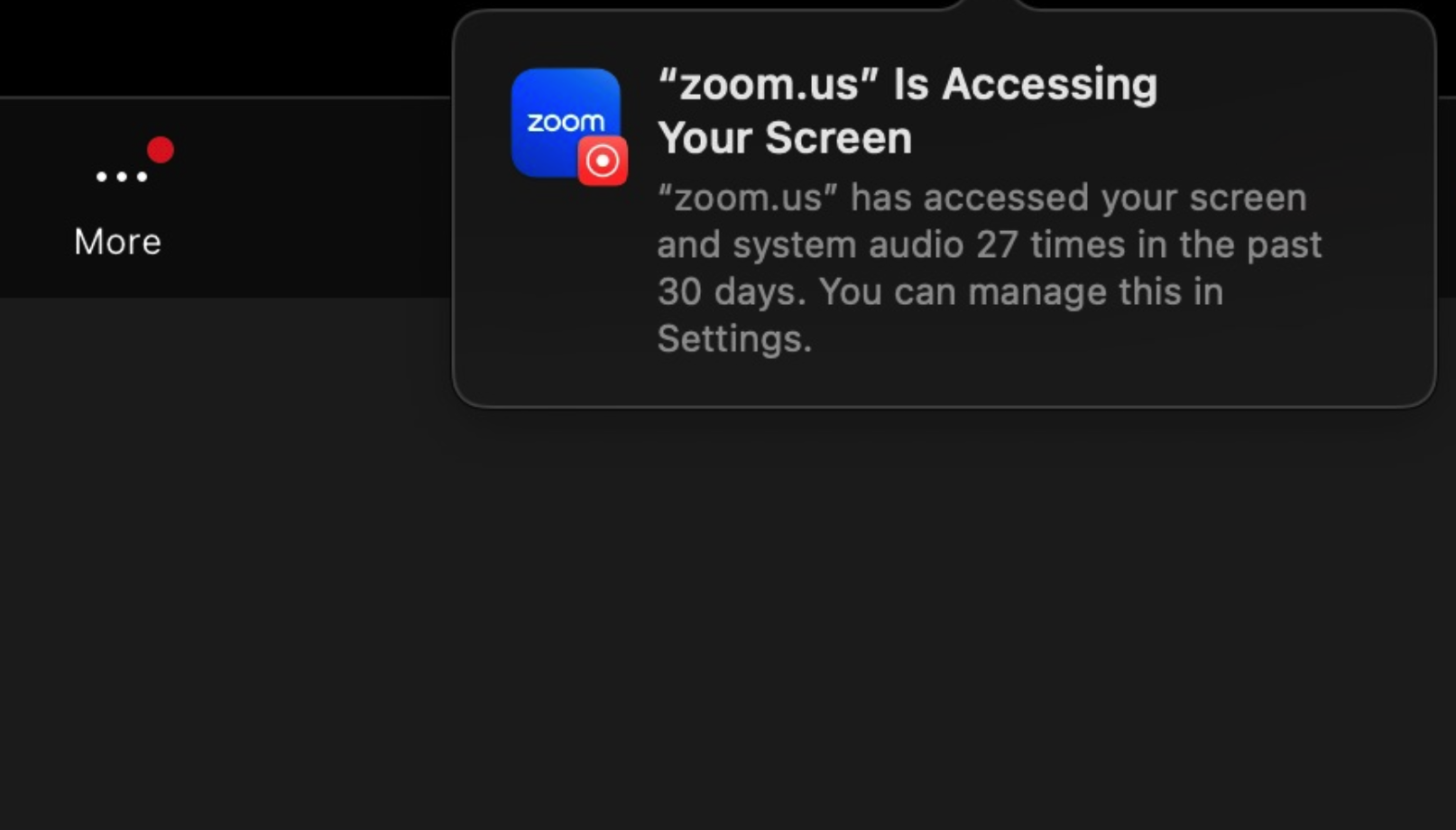 "Zoom.us has accessed your screen and system audio XX times in the past 30 days. You can manage this in settings."