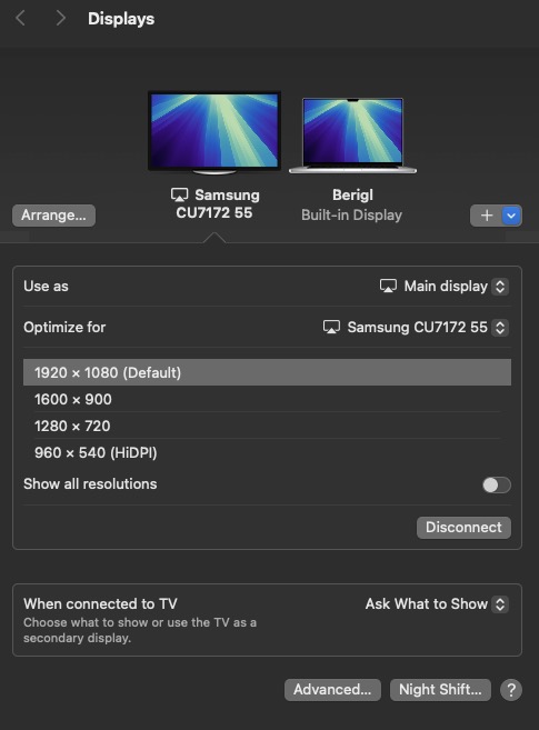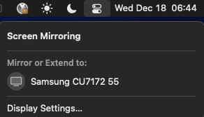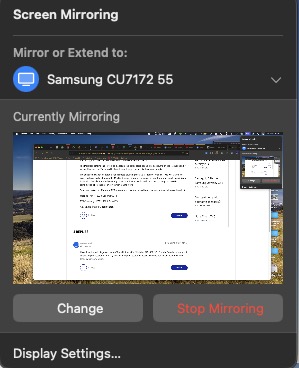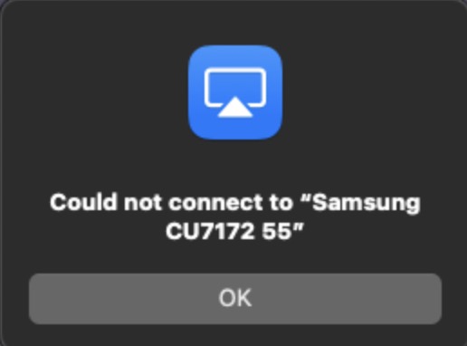 Last week, before upgrading my macbook Pro Mac14,6 with the latest update 15.2, I was able to connect to my Samsung ** 7172 55. I have confirmed the bug with a second macbook air also updated to 15.2. The Samsung smart TV was already running the latest software and worked perfectly mirroring the screen of my Apple products. Now while the Screen mirroring software is able to list, and connect, it no longer displays. There is only a black screen on the Samsung, and then times out. Sometimes on my macbook I get the message it could not connect.