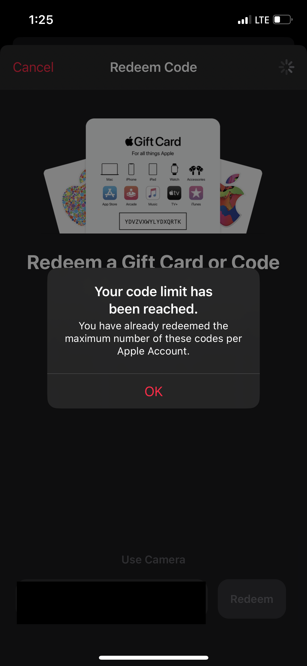 I tried to redeem a code for my Apple Music subscription and it’s saying my code limit has been reached that I have already redeemed maximum number of these codes per Apple account