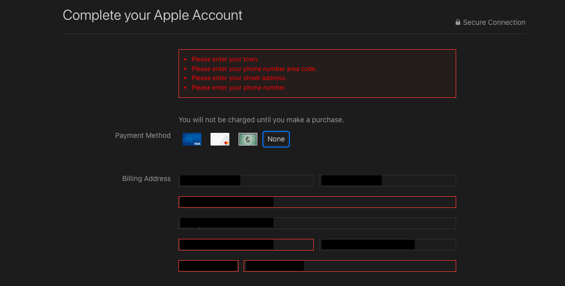 Unable to fill billing address in Apple Account