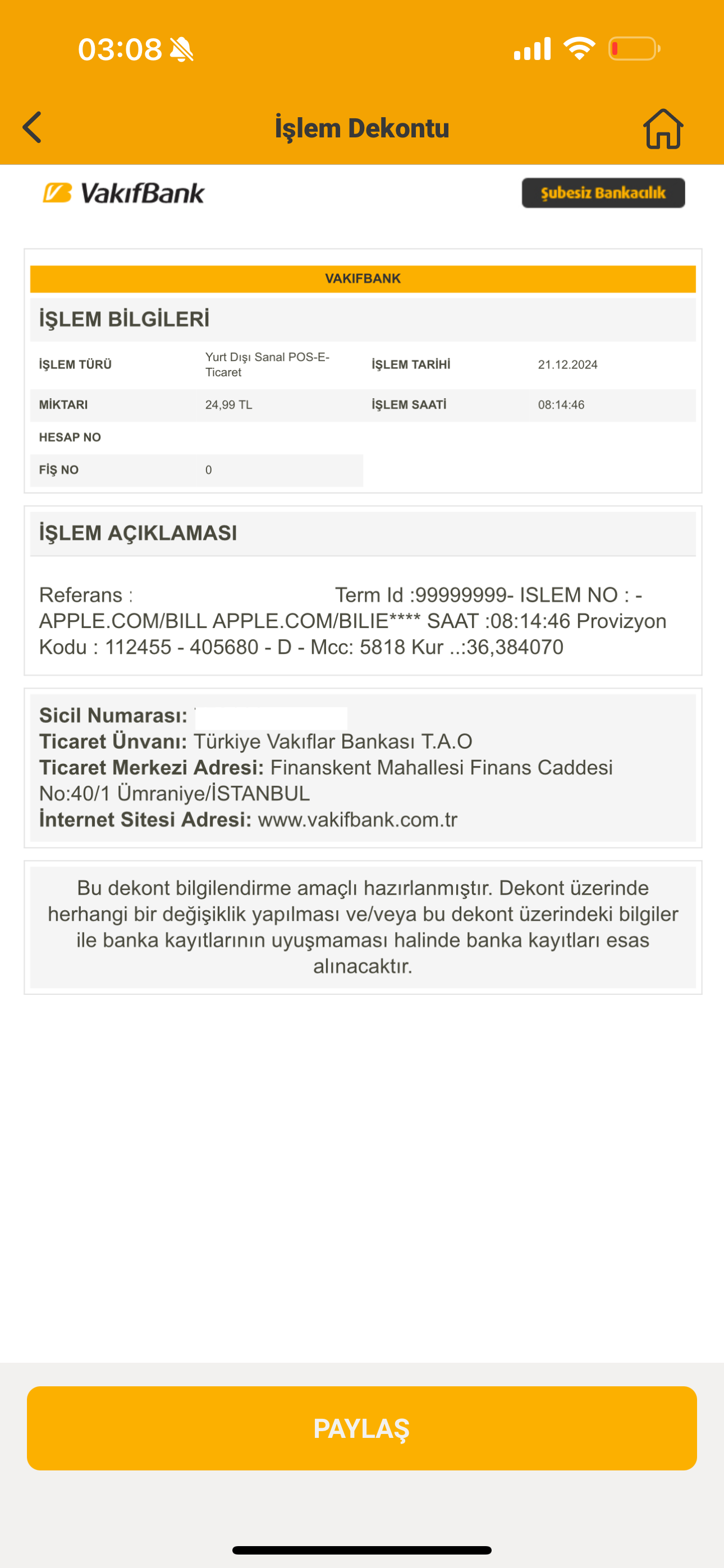 Unidentified 24.99 TL withdrawal from bank account by Apple