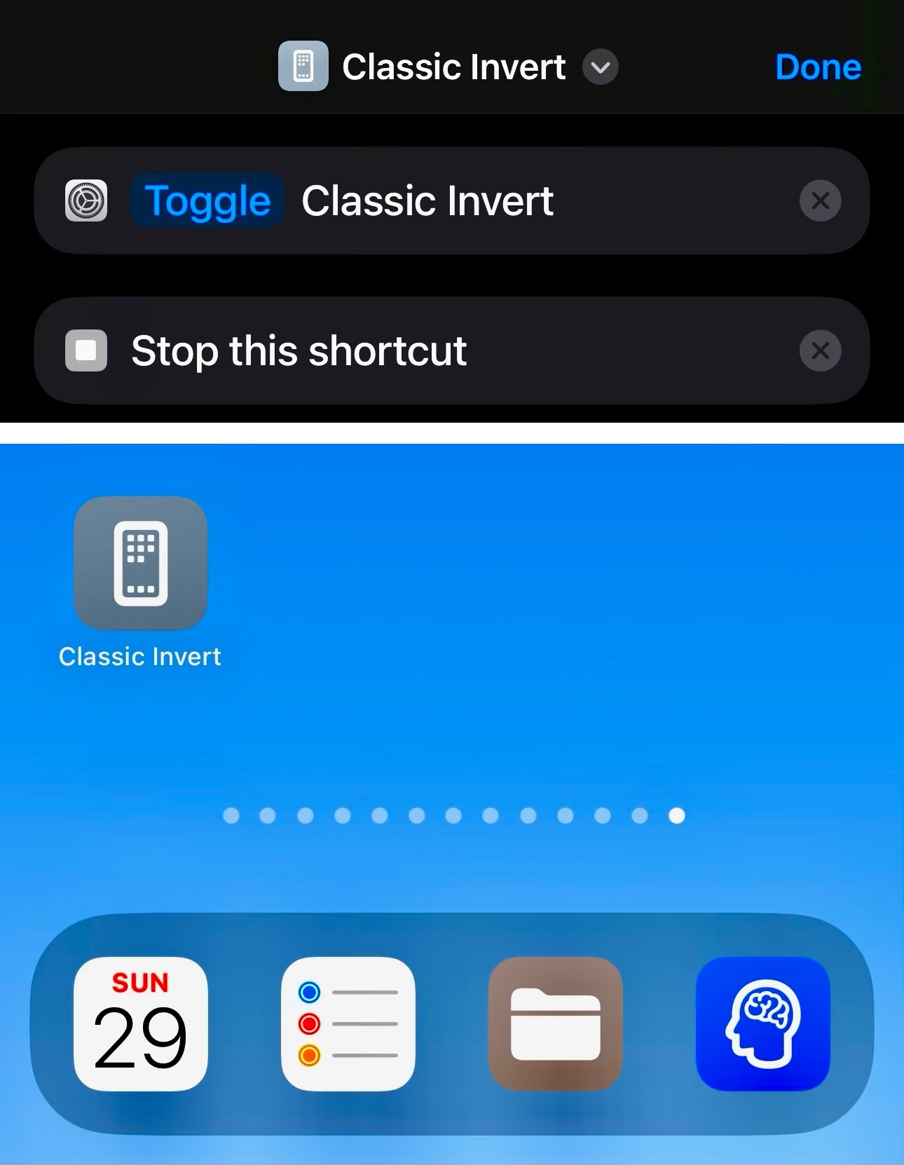 this has probably been mentioned before but I just wanted to share a cool way to view files using a ‘dark mode’ of sorts. by going to ‘accessibility' in settings, then going to ‘display & text size’ and enabling classic invert, when you go on the files app and view some pdfs that are too bright to look at at night for example, the background will be black instead of white. this helped me to read books online without straining my eyes too much. hope this is able to help someone!