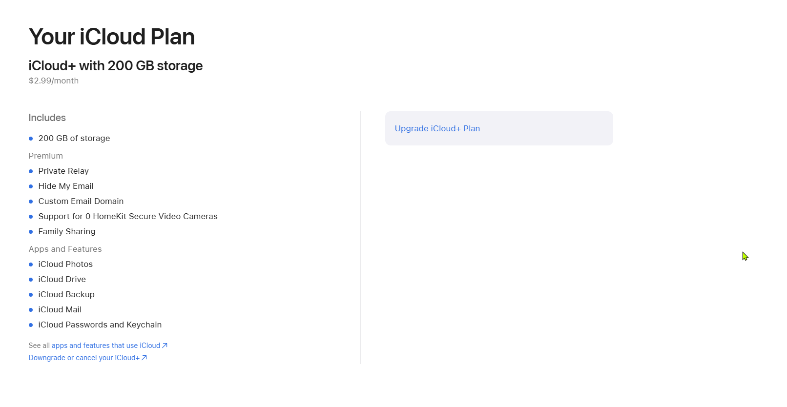 • I have attempted to do this on my laptop using the instructions found on Apple's site (Downgrade or cancel your iCloud+ plan – Apple Support (UK) However the options it tells me to follow don't exist for me. When I get to the account page I only see this: