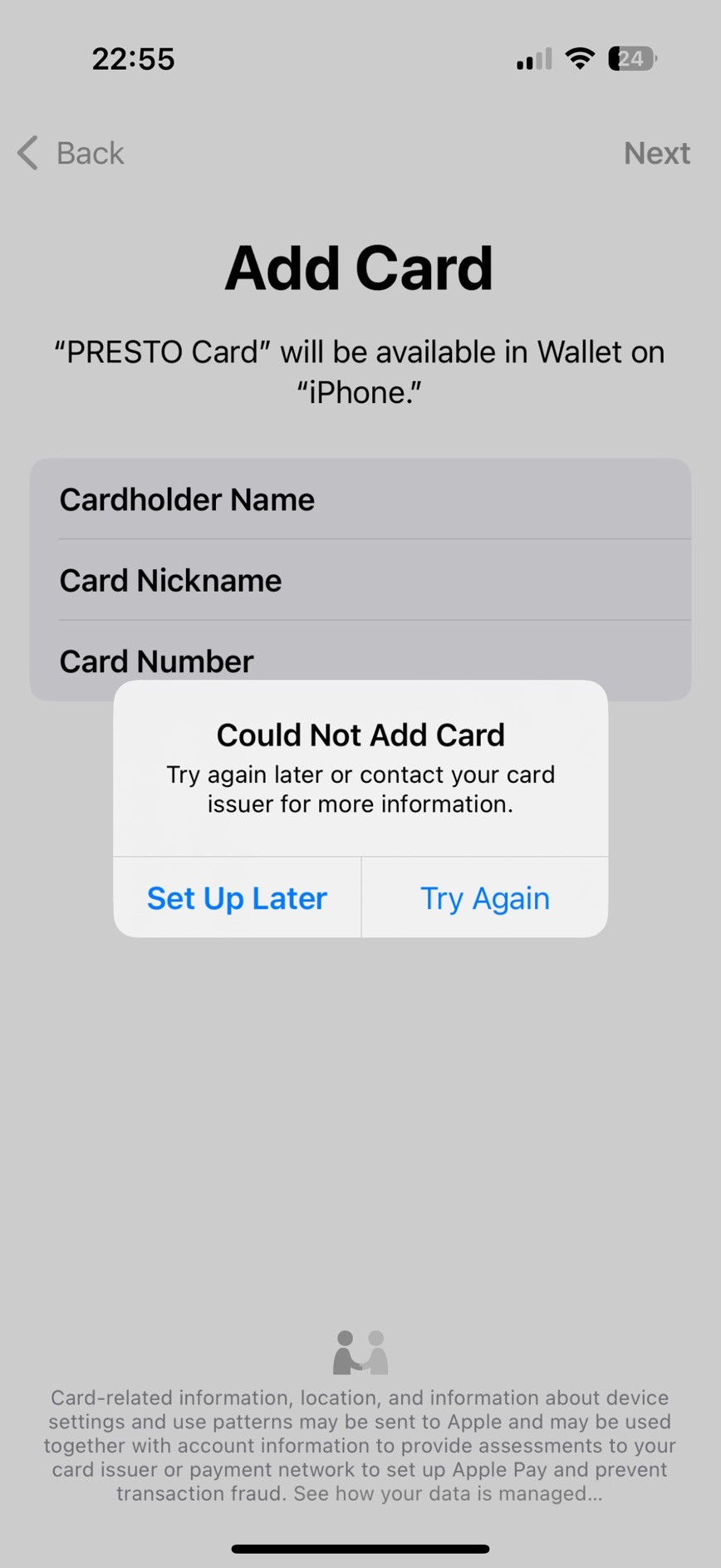 The problem: Adding the Presto card to Apple Wallet triggers an error it's been a month since Presto told me to just wait for 2-4 weeks,