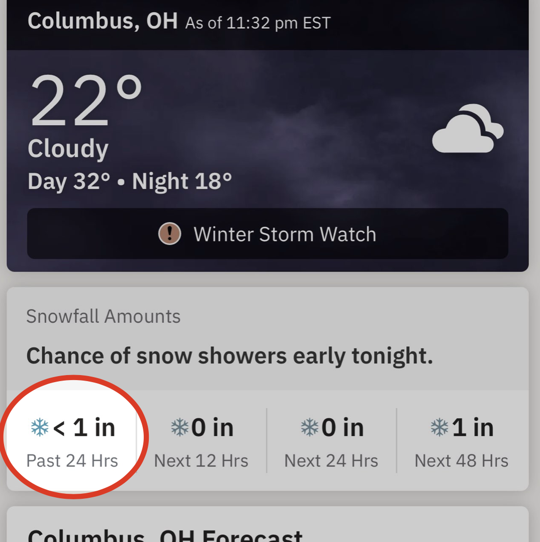 And it's not just Columbus. In Hudson, Ohio, they had like 6–7" of snow (according to both the Weather Channel app and my family who lives there), but the Apple Weather App says they got 94" yesterday. Sure.
