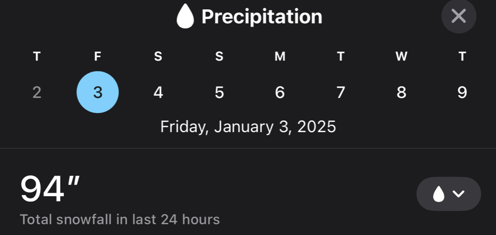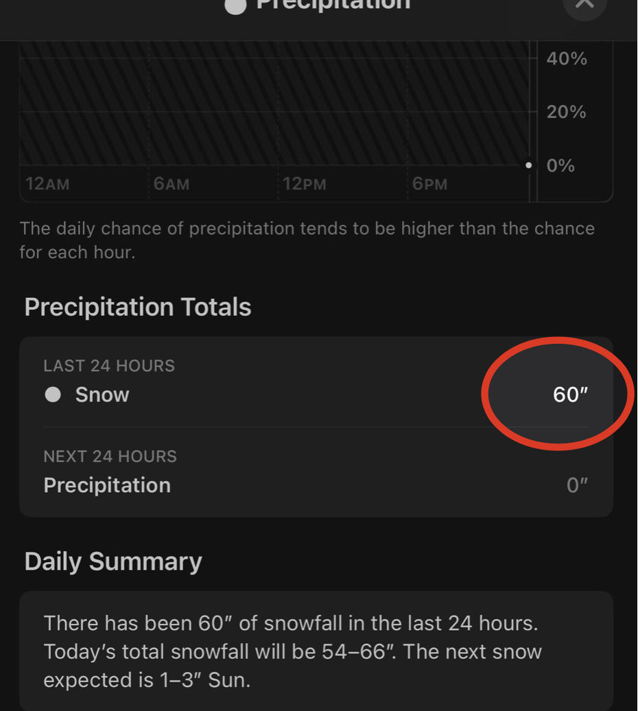 This lines up with reality: My back yard has a little more than a dusting of snow. But for some reason, the Apple Weather app thinks we've had 60" in the last 24 hours: