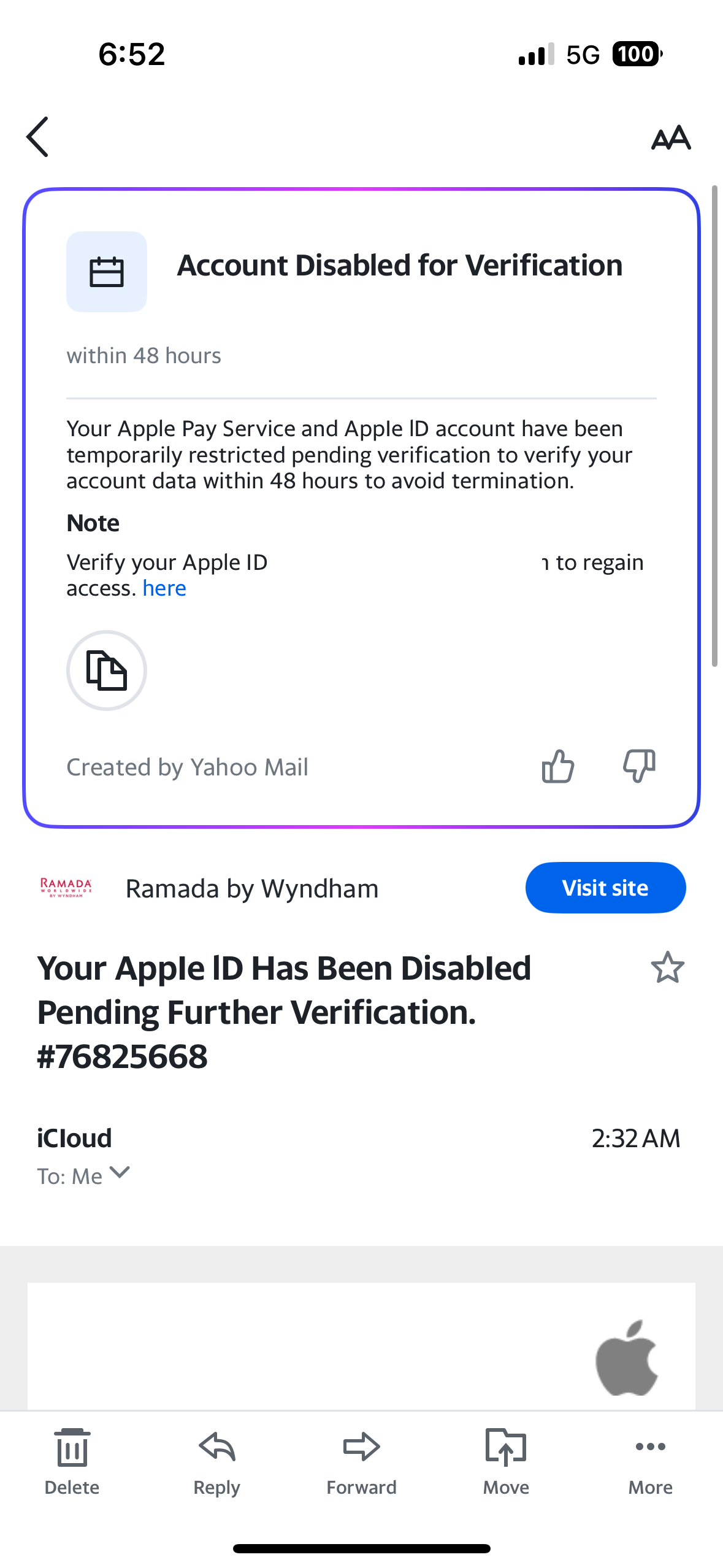 If you are uncertain about a message and a resource provided in that message, do not click on any links in the message. Try to use an Apple resource you know is valid to independently verify what the message is claiming. Go to a support article page on apple.com and use the instructions in the article to verify though Apple itself, or use an Apple device feature such as Settings or an Apple app. To ask Apple start at this web page: Official Apple Support If you wish to investigate links, this post by contributor MrHoffman describes how you can do that —> "Keep your Apple Account safe and secure"… - Apple Community (the link takes you to the end of the post so scroll up a bit).