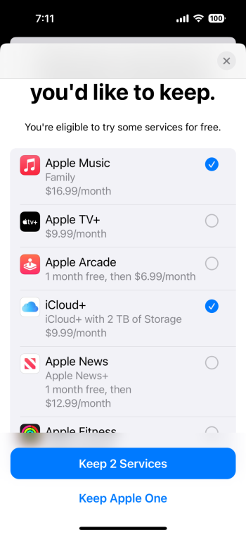 I currently have an active subscription for Apple One Premier which includes 2TB of iCloud Storage. I also have a new subscription from Verizon for Apple One Family which only includes 200GB of iCloud Storage. I would like to cancel my Apple one Premier subscription and only use the Apple One Family subscription, but need to also add the 2TB iCloud storage option I currently have with Apple One Premier. I do not see an option to add the 2TB iCloud storage in Apple One Family, probably since I already have it with Apple One Premier.