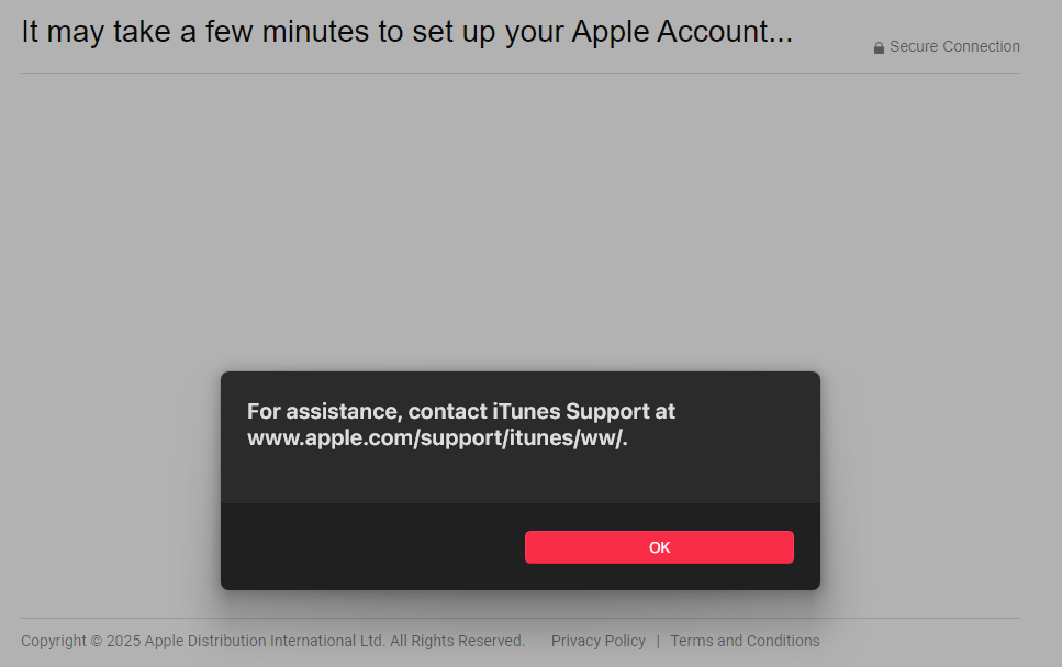 Hey, I'm trying to login into the Apple Music app on Windows 11, but nothing happens after I enter the login and password, if I try to create a new account it provides me an error: