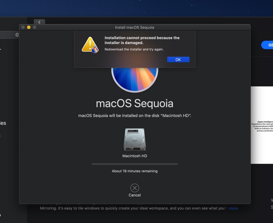 I recently tried to upgrade my 2019 MacBook Pro to Sequoia. Kept getting error message (can't recall original error message), so decided to perform a factory reset. During the reset and specifically with installing the latest available OS, Sequoia, I kept getting a message that "Installation cannot proceed because the installer is damaged".