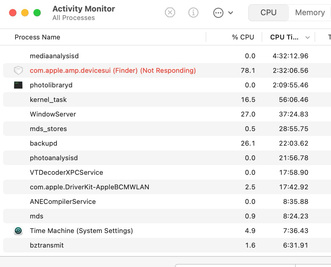 When I look to Activity Monitor I see that com.apple.amp.devicesui (Finder) is Not Responding, so it looks like something is malfunctioning when I do this.