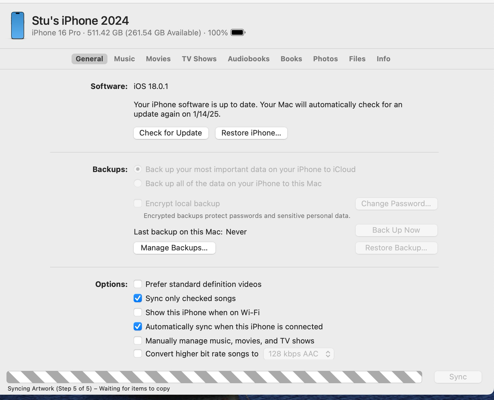 For years now, my iPhone sync with my Mac computer has never successfully finished. It always gets stuck in the "Syncing Photos (Step 5 of 5) - waiting for items to copy" phase with the syncing circle visible on the Finder sidebar. I sync my phone a couple times a month, and just make sure to give it plenty of time. Once it's been stuck in that state for long enough, I can either unplug it, or try hitting eject, and get my phone back. I'll find that my photos have imported and synced to my phone, along with my playlists on Music, as long as I gave it enough time. However, it doesn't give me options to Manage my Backups, and I get the impression that something isn't working properly.