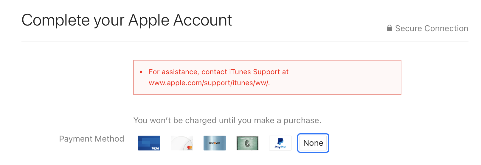 If the above does not work, the resolution to this issue is often making sure you have entered a credit card or other valid method of payment* even if you plan on using account balance to pay for a purchase or the item is free; e.g.: Sign in to your Apple Account - Apple Support
