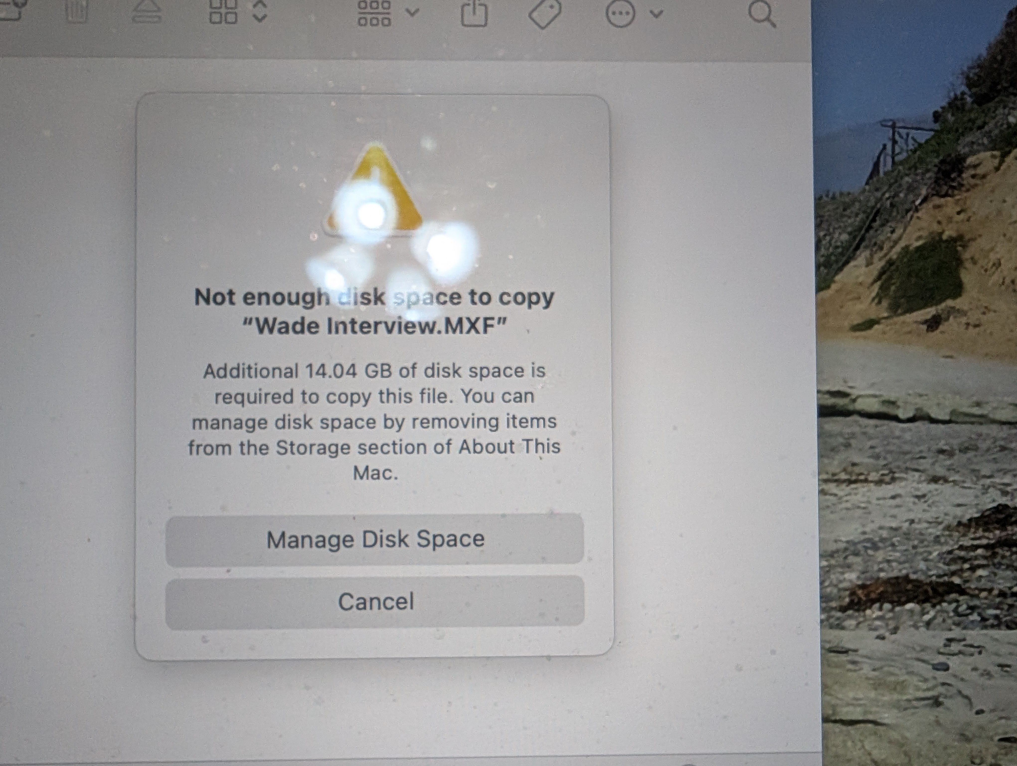 I'm trying to copy a file from a prograde 256 gb card (SDXC II) to a 1 tb SanDisk External Protable SSD drive. However when I try to copy this file it comes up saying "additional 14.04 GB of disk space is required to copy this file. You can manage disk space by removing items from the storage section of About This Mac".