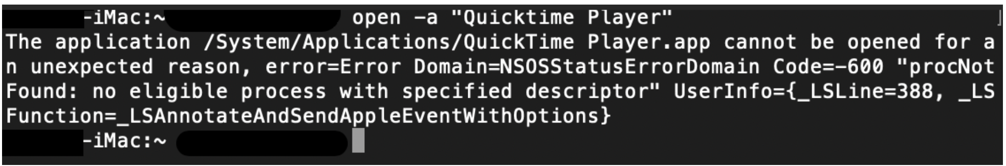 - If I attempt to open from Terminal while Activity Monitor still shows a process, I get the usual "app is not open anymore" or "app not responding" message. If I force quit the process in AM and try to open in terminal, nothing happens at all on screen and I get a message like this: