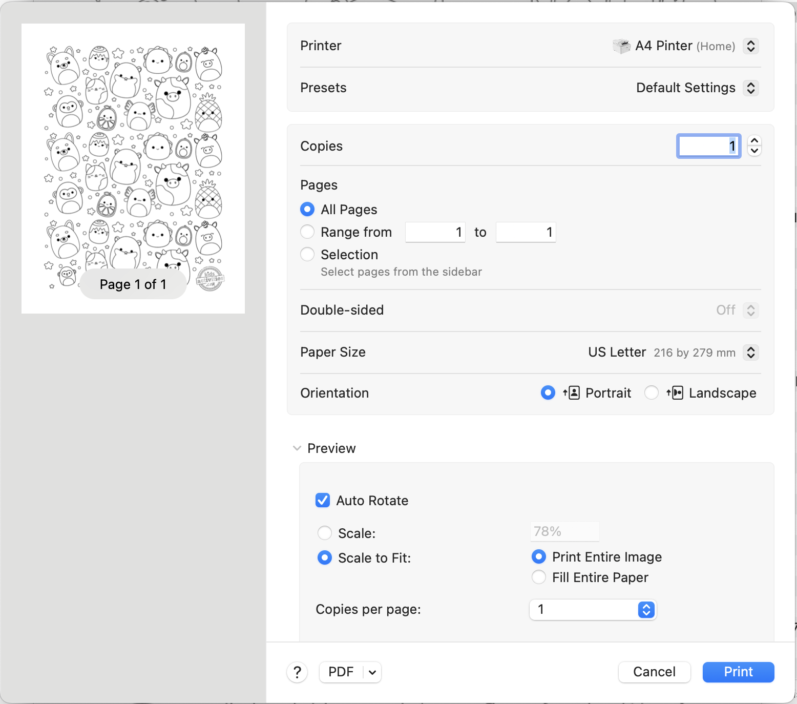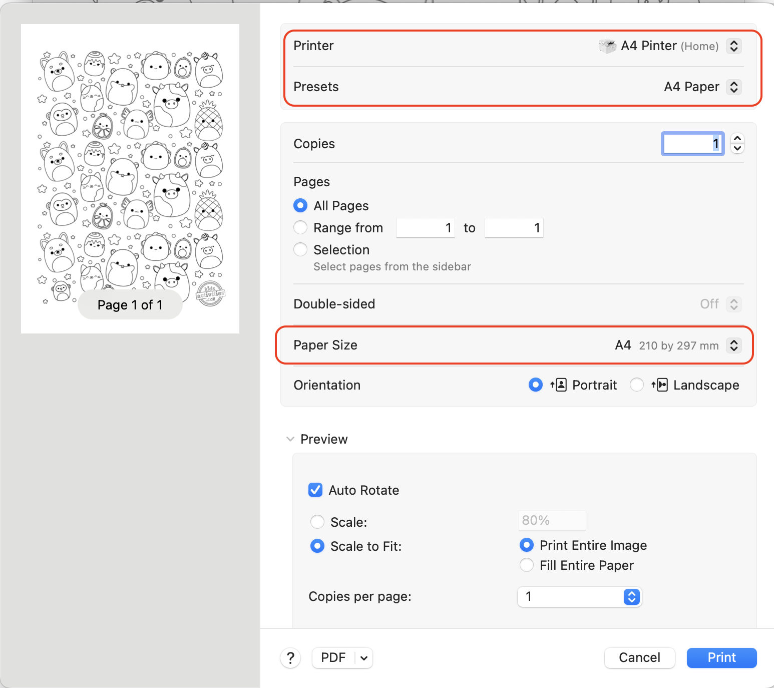 A4 printer preset with A4 paper size