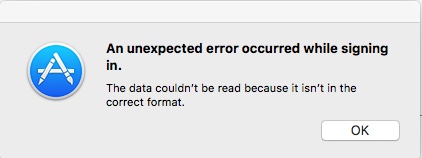 I wanted to see if there are any legacy Mac users out there running OSX 10.12.6 (I'm on a late 2009 29" iMac i7) that might be having the same issue. I am trying open an app that is requiring me to connect to the App Store using my login credentials to confirm my ownership of the app. It's the general App Store sign in dialog. After I enter my Apple ID and Password, I get the following error dialog, "An unexpected error occurred while signing in. The data couldn't be read because it isn't in the correct format." Once I dismiss the dialog the app closes. I get the same error when I try to log directly into the app store from within the app store app, so the problem is connecting to the App Store. I've tried rebooting, logging in as a different use, same problem. I can log into iTunes using the same login dialog from within iTunes, so the problem is specific to the App Store.