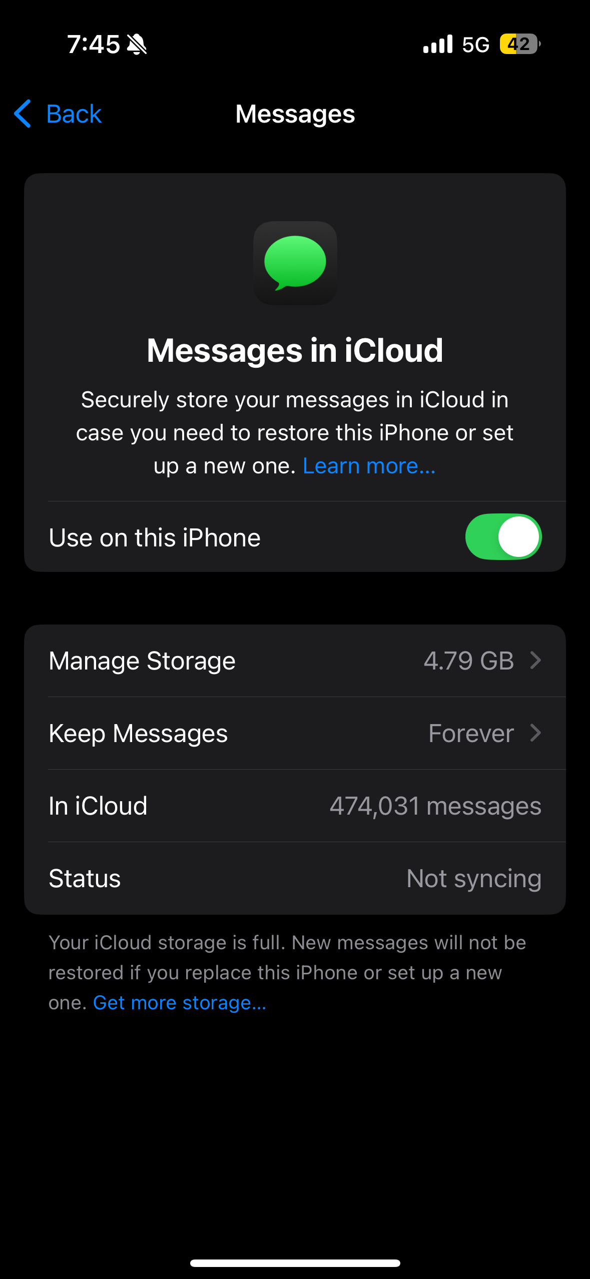My messages have not indexed past about a week ago, which is a problem I've never experienced until now. I had at least a few months' worth of messages about a week ago, but I suspect that the new iOS is preventing full indexing now? When I tried to disable iCloud and re-enable it again to hopefully push my phone to index my messages, it told me my phone can't sync to iCloud because I've run out of iCloud storage — a problem I've never had until recently. Do I really have to pay $10 just to have access to my messages?