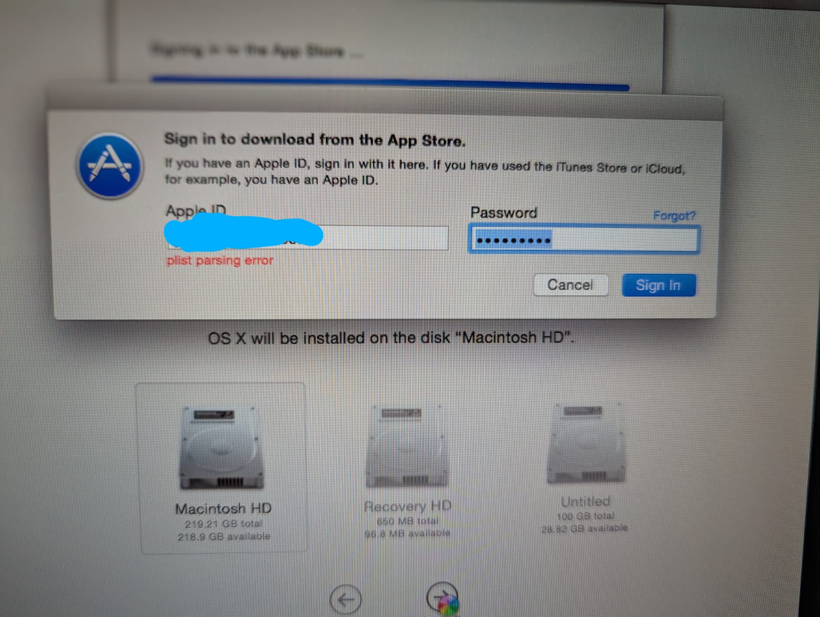 "Install OS X plist parsing error: I tried to factory reset my old MacBook pro 2011, when I tried to login using apple ID it show error 'plist parsing error' The step I took is: 1. Go to recovery mode 2. Go to disk utility and then erase the drive 3. Go to reinstall OS and when I tried to sign in with my apple ID there is error Is there a way to fix this issue?"