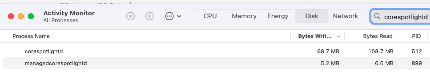 The spotlight index was rebuild. After that there was still another 500 GB of writes over the course of about 2 days. That doesn’t seem normal.