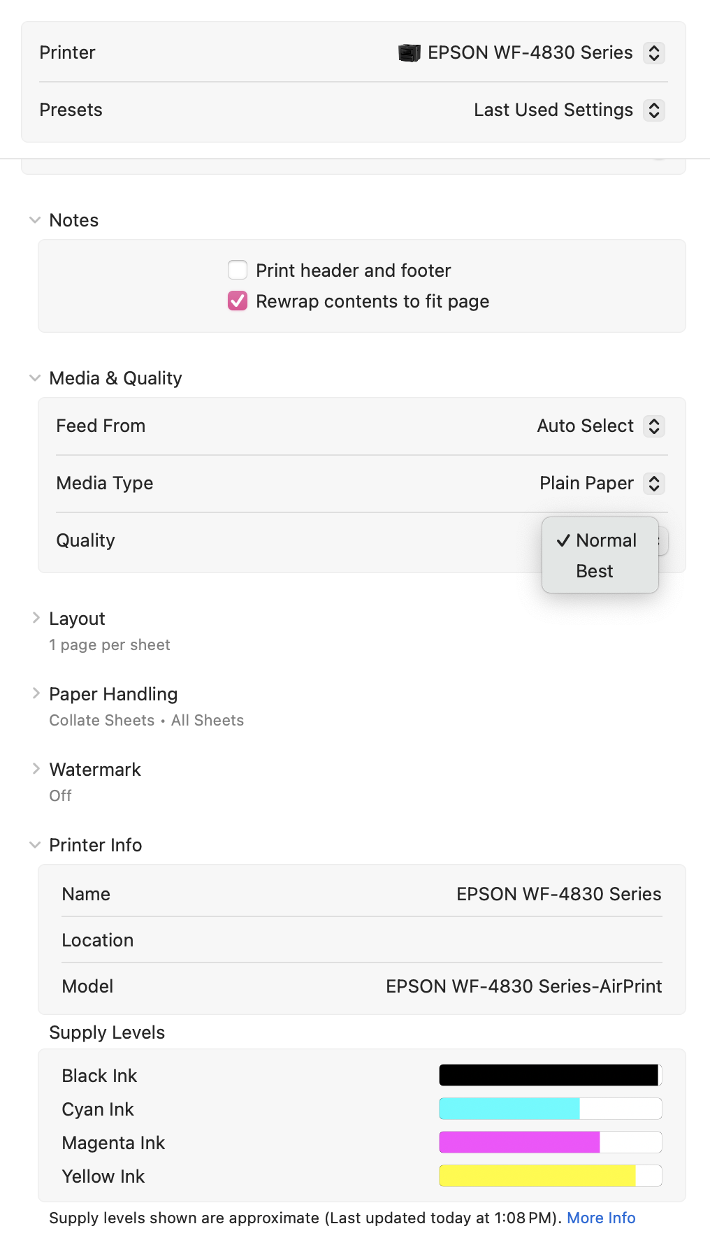 The reason I purchased the Epson WorkForce Pro WF-4830 is because it offers Draft quality printing. Printer ink is so expensive, right? I currently print using the EPSON WF-4830 Series driver, but the only quality options I have are Normal and Best.