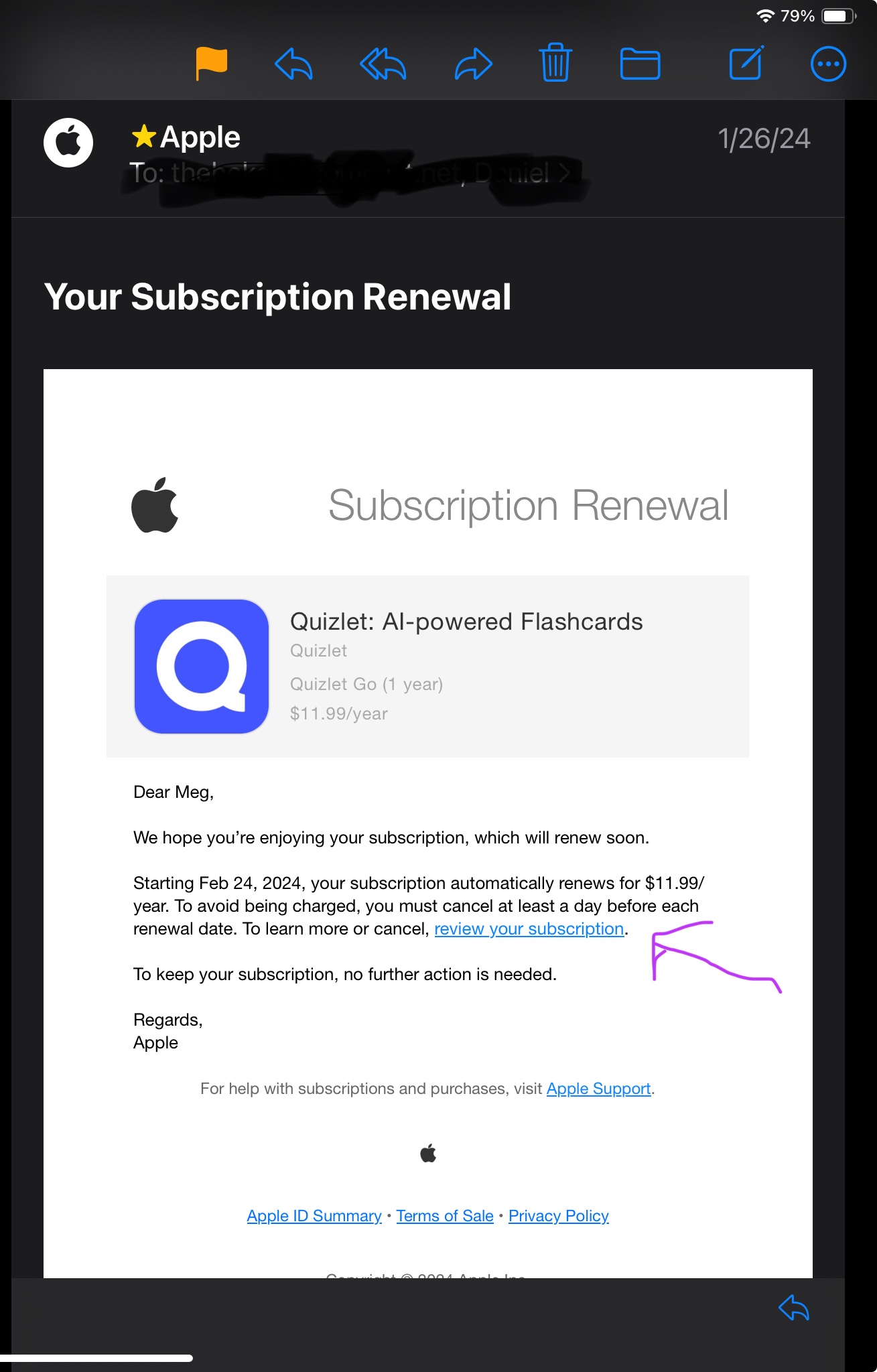 The problem is, the link in the email doesn’t work. It does not take me to the subscription. Also, none of our family members show a subscription in our iCloud accounts or App Store purchases. Does anyone have any ideas how to track down this subscription? When I contacted QUIZLET they stated that purchases through the Apple App Store need to be resolved through Apple. I am now stuck in a circular function. I welcome any ideas to cancel before the subscription renews.