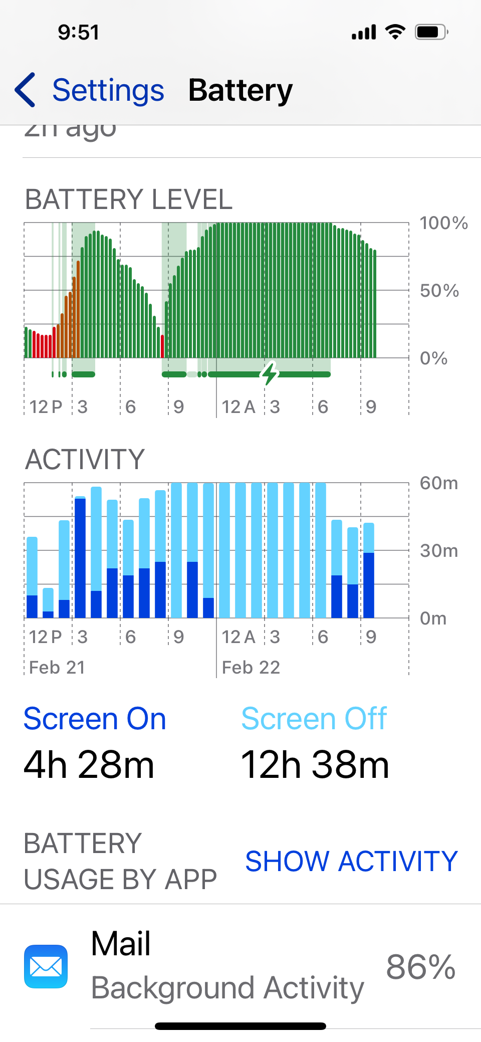 (As advised here) turned phone Off for overnight charge - set 100% (had set recommended 80% prior) - turned On this morning and battery still at 100% after 2 hours!! Still have Mail “background activity” on battery usage, but promising, let’s see what Mail “checking for mail” does to battery today - still not bringing in today’s mails I can see in my Gmail app.