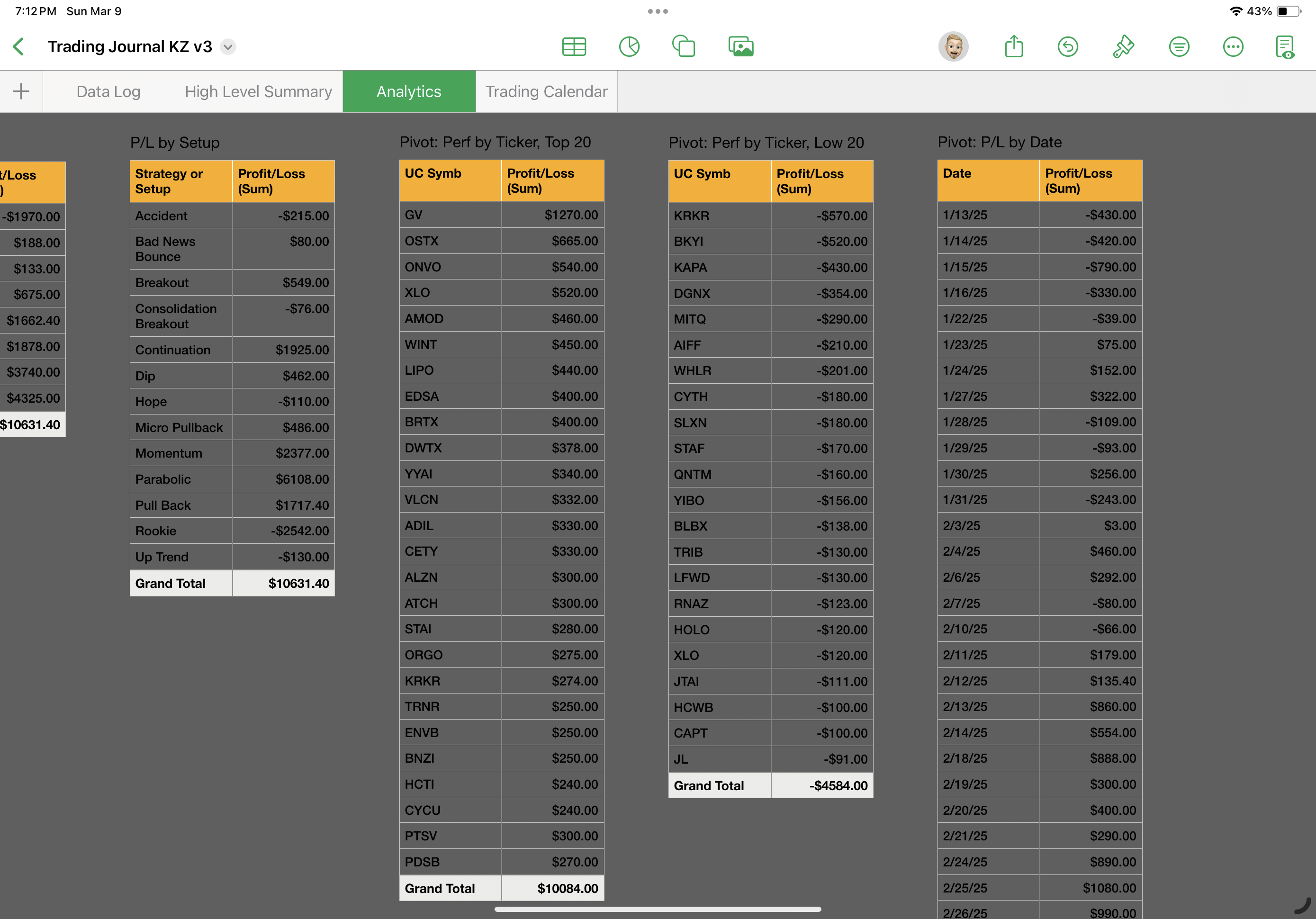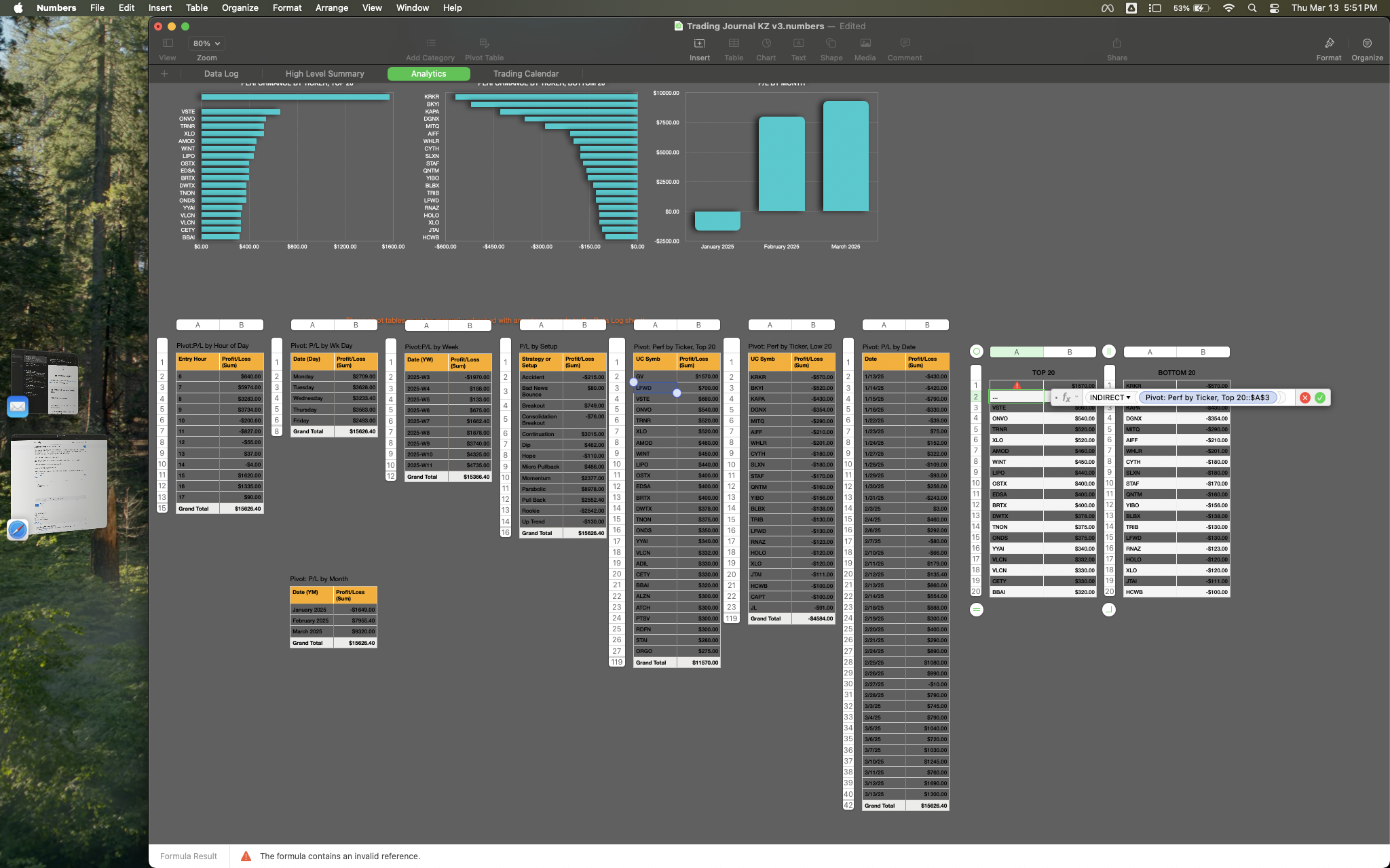 Note: for stocks that appear multiple times, I want them added together and for their sum to be used in the sorting. The summing is being done properly and a stock traded multiple times does appear only once in the pivot table, with the correct profit or loss amount as column two.