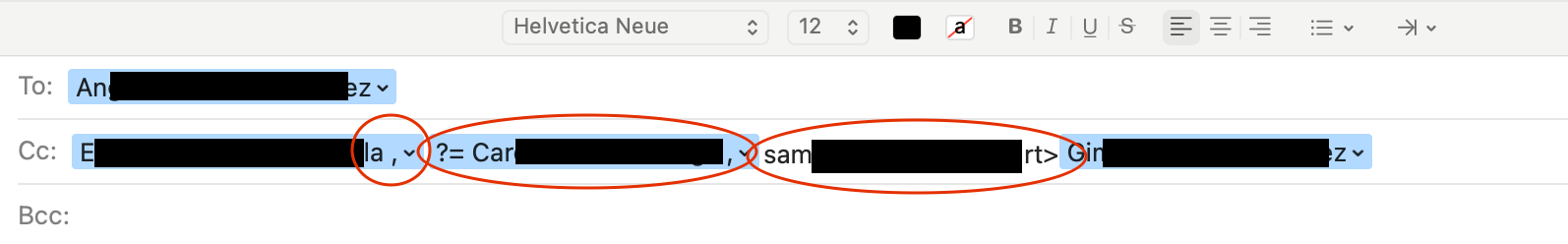 - The other issue is that some emails I am receiving, if I check them in Mail the senders and CC's email addresses are all mess up (see image).