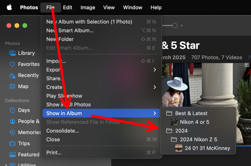 I've also marked where the Info Window shows that this picture is in two albums. If you click on the > arrow, it will show you which two albums.