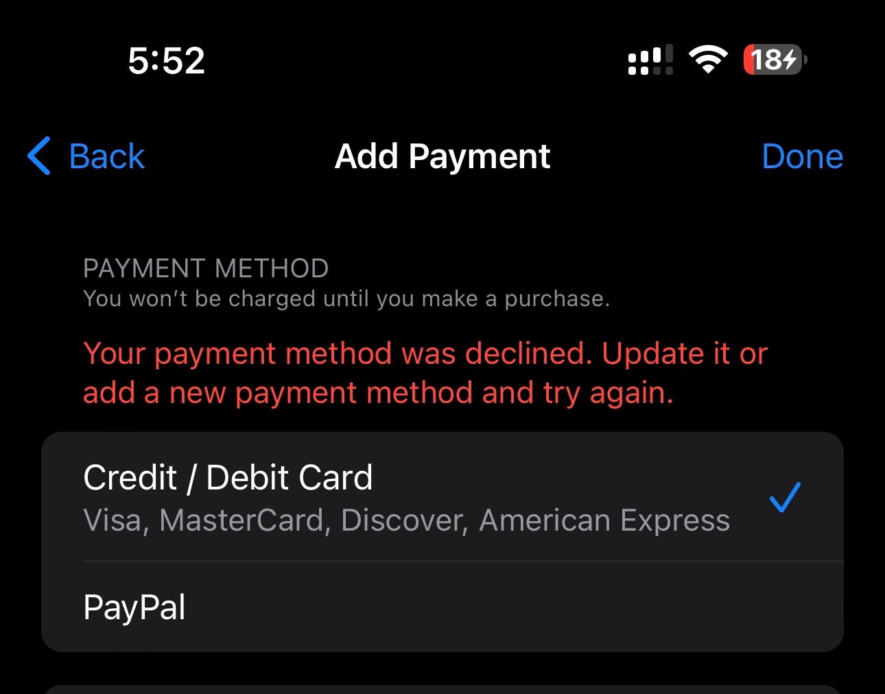 The screen indicates your payment method was declined.