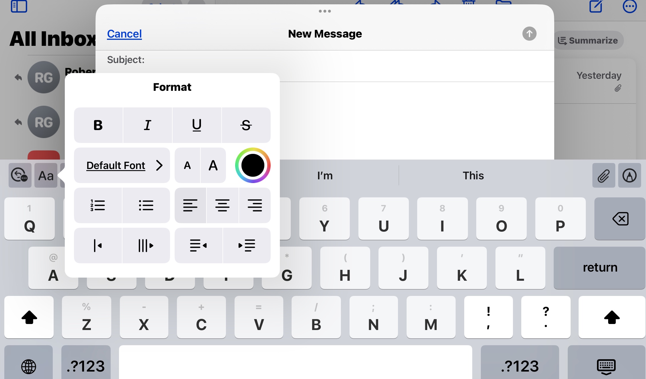 For the life of me I cannot figure out or find a procedure that works to edit the font within a mail. I have read there should be a key on the iPad keyboard to open the font editor but I do not have it. Any ideas?