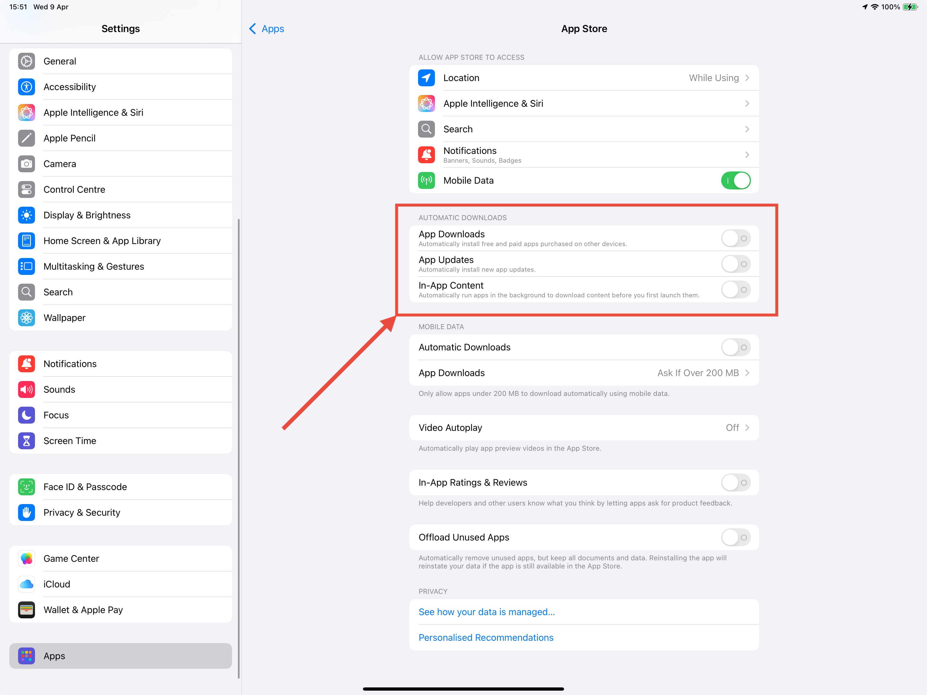 Hi. Since I’ve updated my iPad mini for 18.4 the option for turning off automatic updates for apps in App Store menu is not available anymore. I researched forums and Apple tips and could not find how to disable automatic updates for apps in my iPad mini
