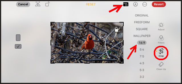and I pick either FREEFORM or a preset aspect ratio. Then I grab the corners and drag them in. If you don't choose that top sizes icon, then cropping should be in freeform.